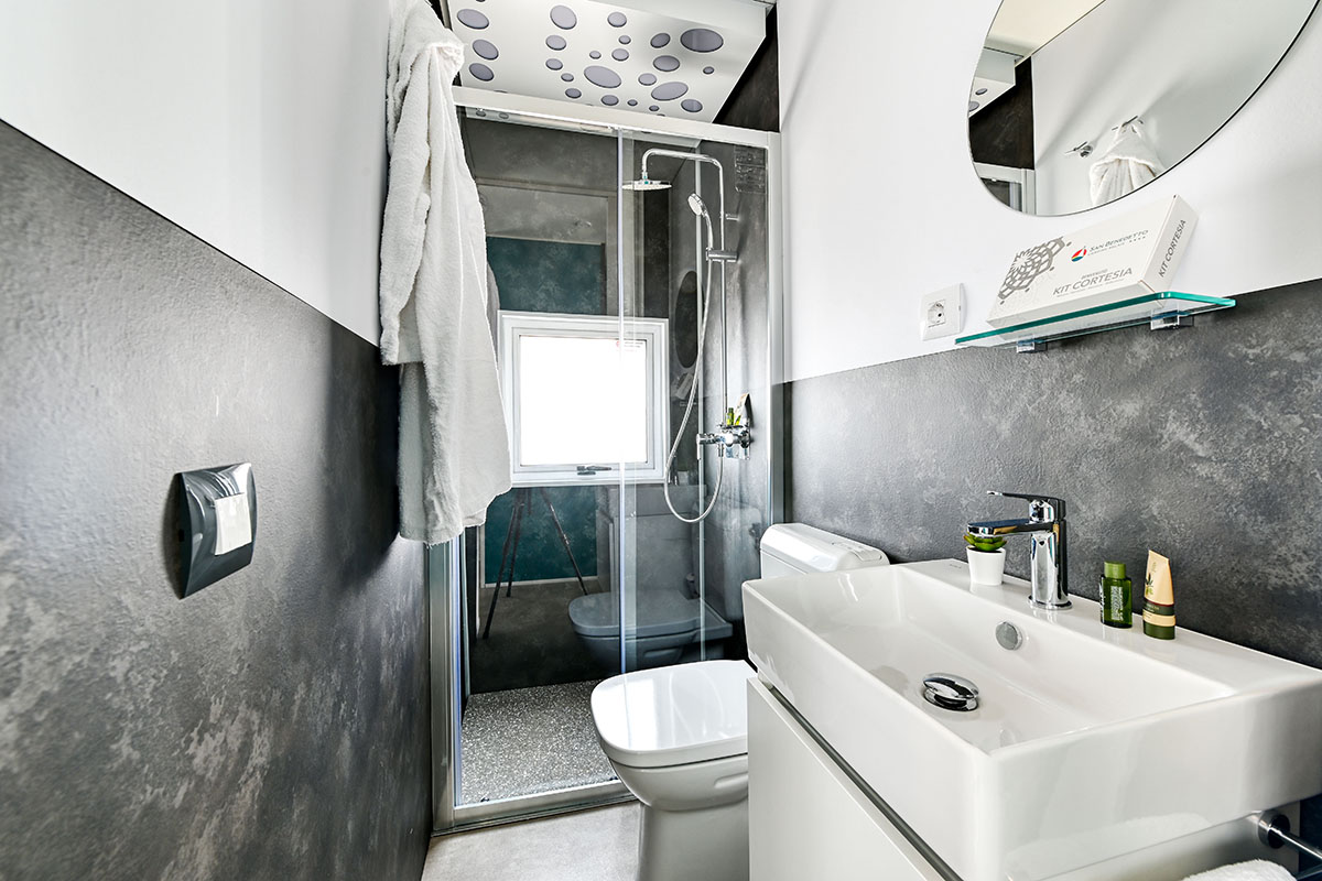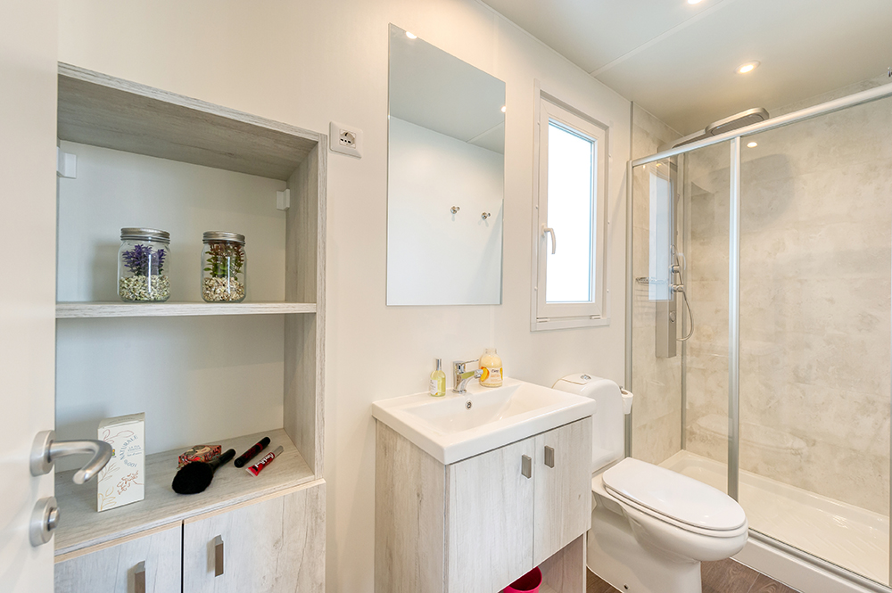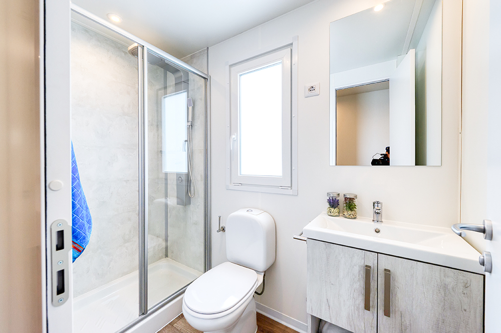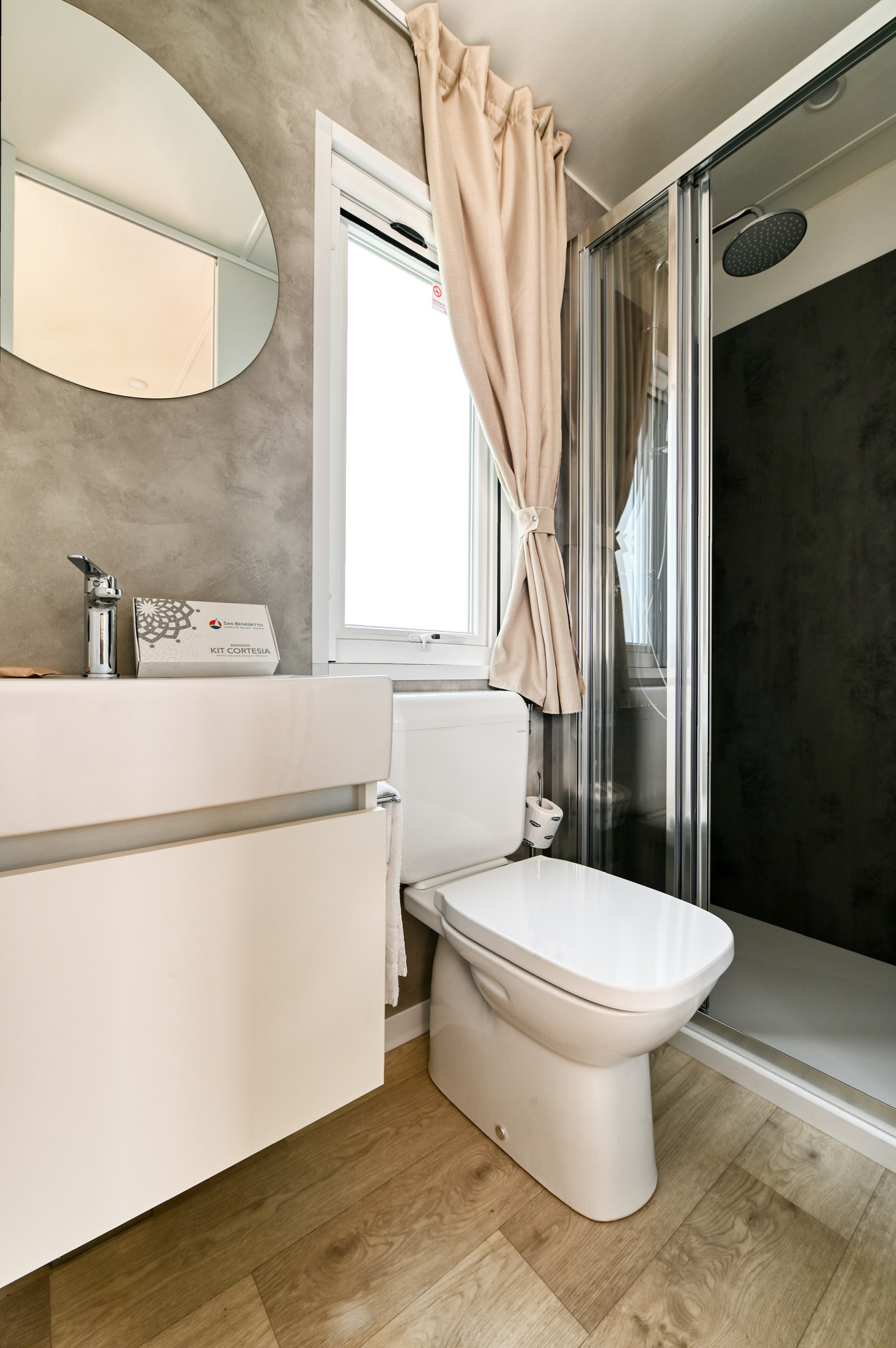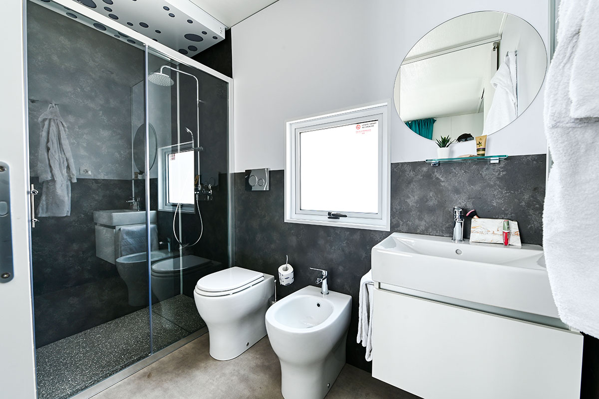 Das Hauptbadezimmer, das sich im zentralen Teil des Mobilheims befindet, ist komplett und mit einer emotionalen Dusche mit Farbtherapie ausgestattet.