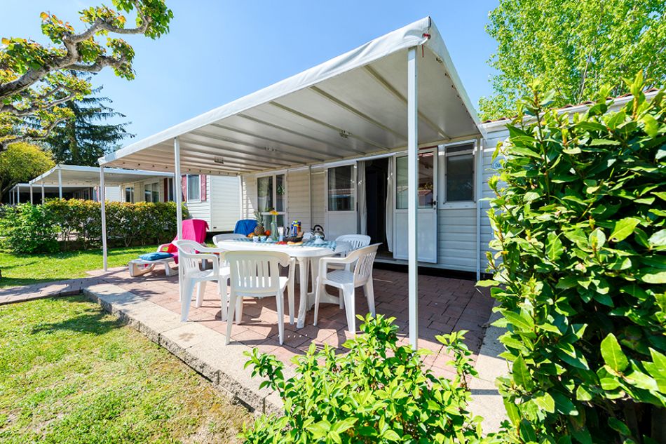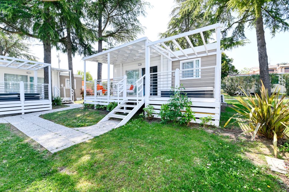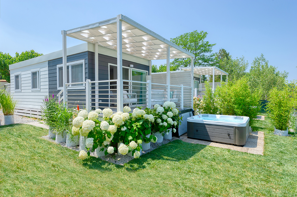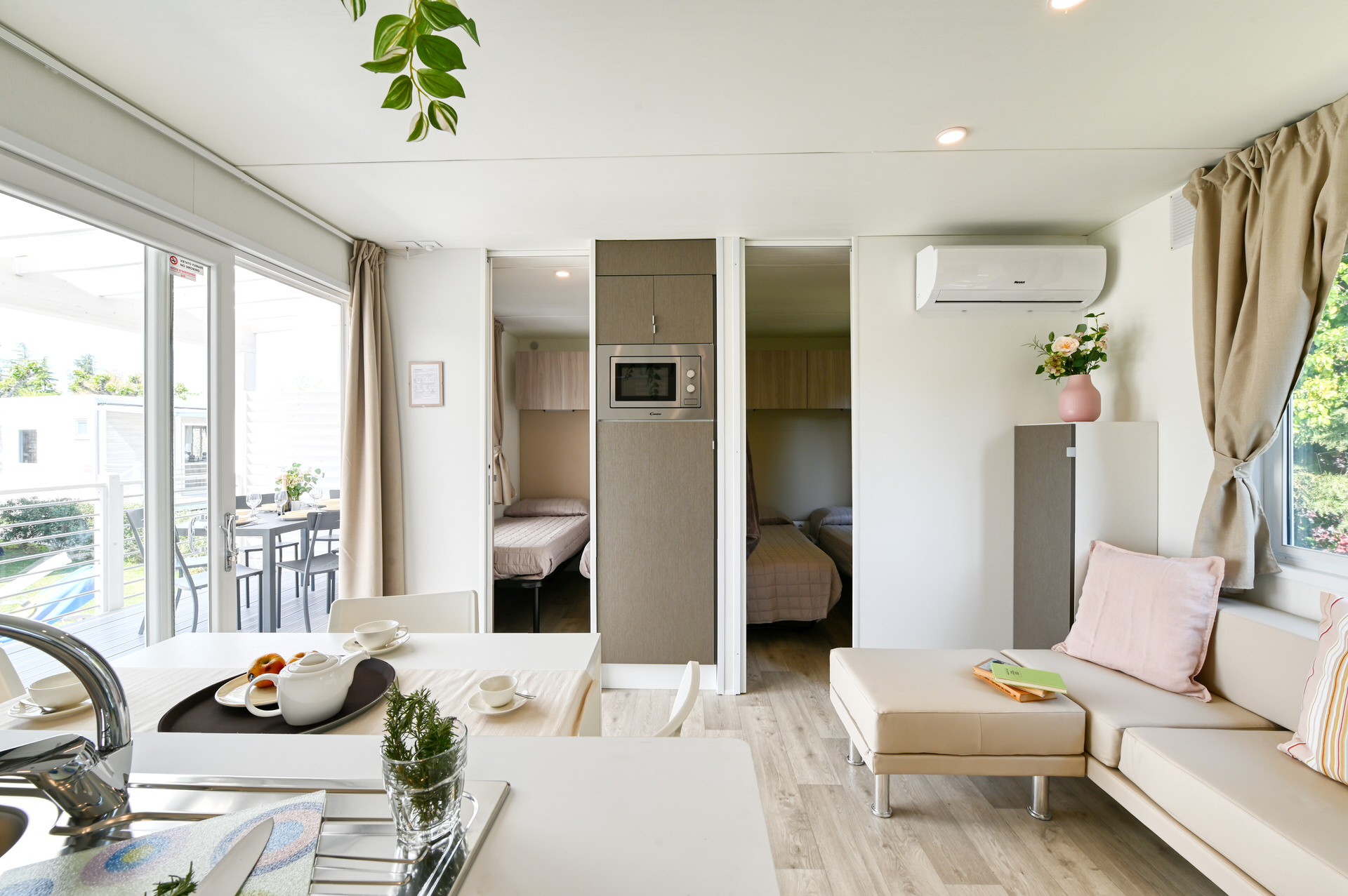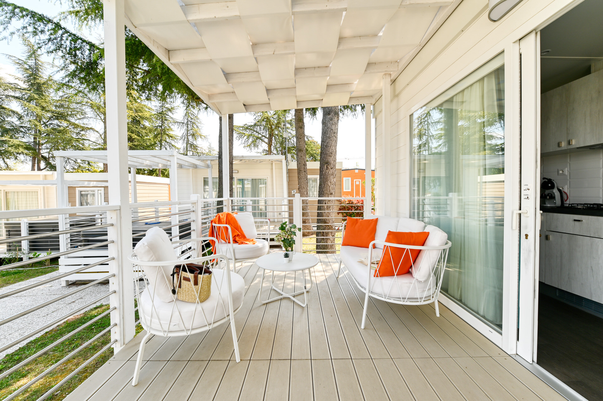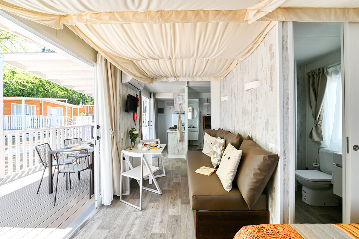 Eleganz, ein weiter Raum und Bequemlichkeit vereinen sich in Garden, die größte Mobilheim von San Benedetto Camping Relais.