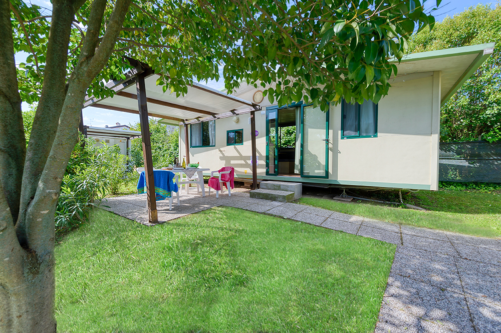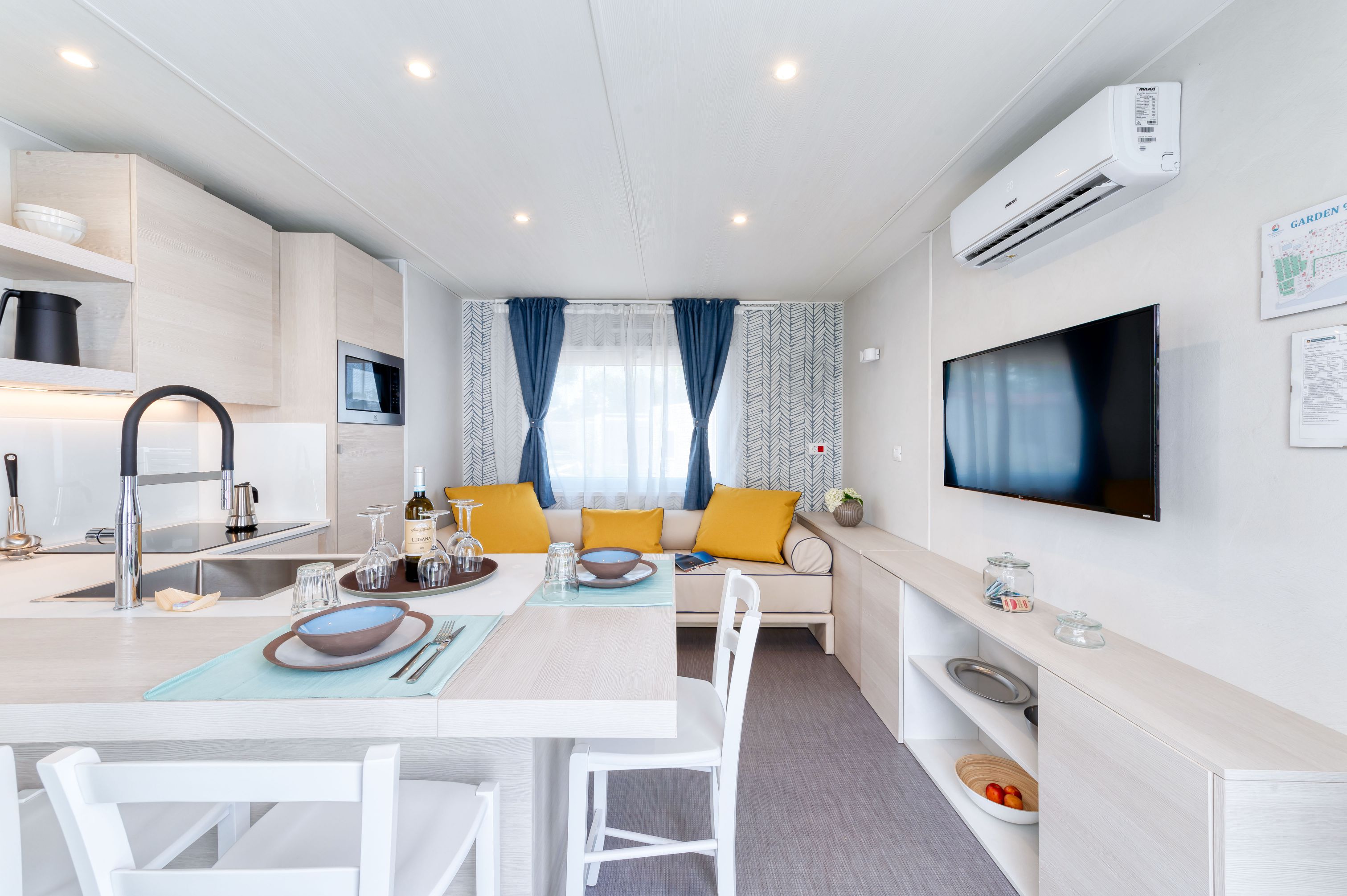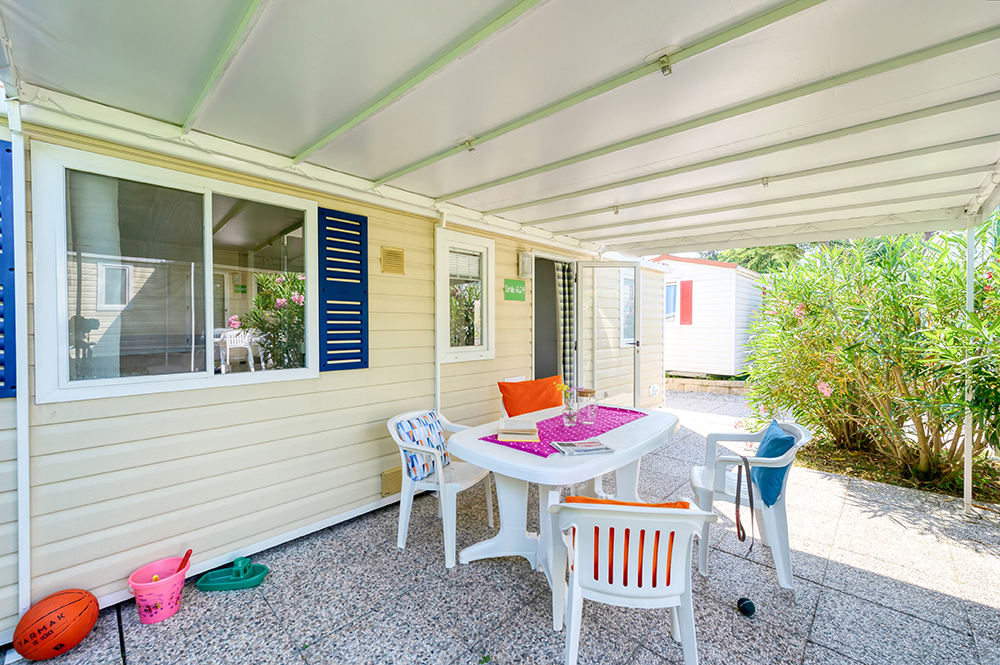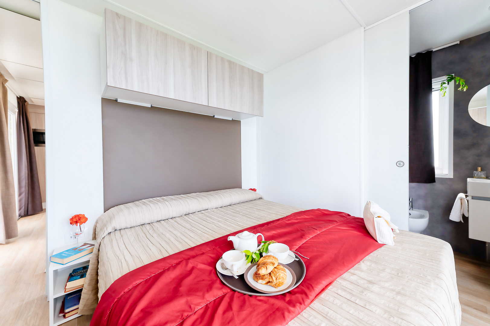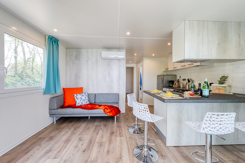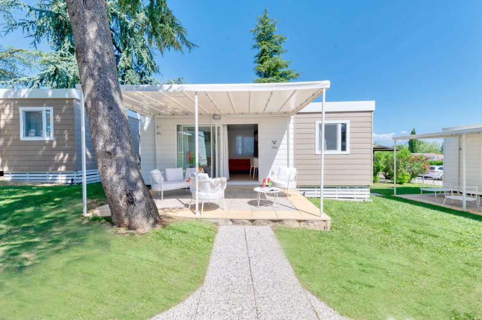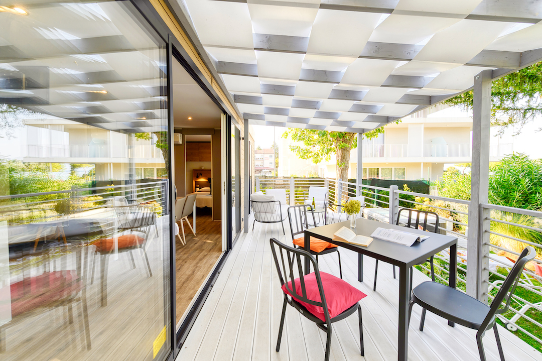 Eleganz, ein weiter Raum und Bequemlichkeit vereinen sich in Garden, die größte Mobilheim von San Benedetto Camping Relais.