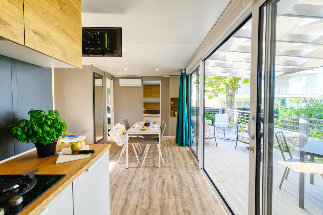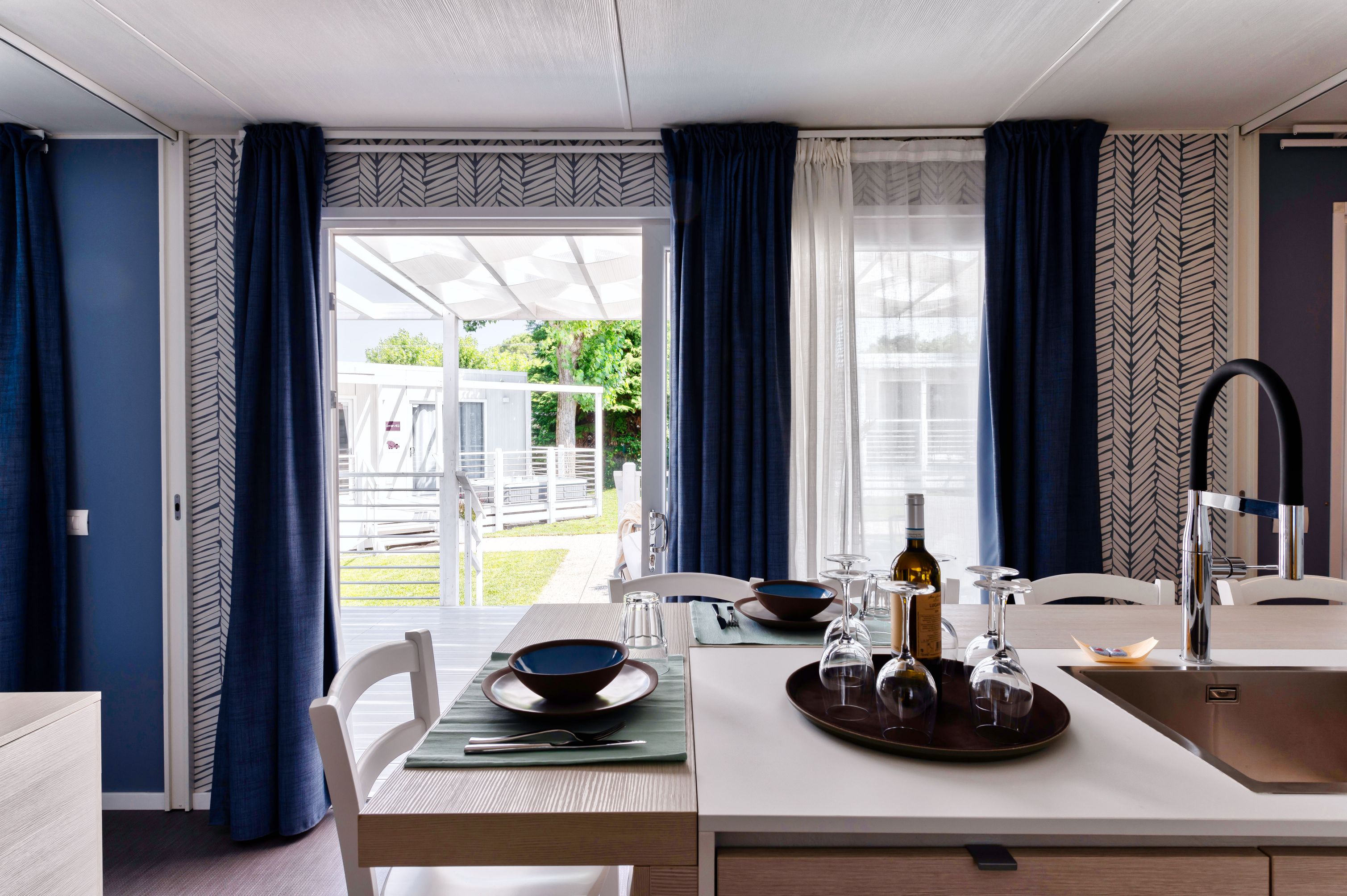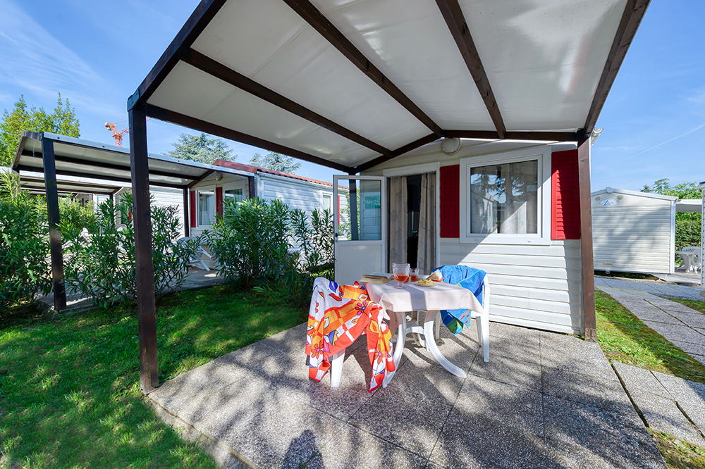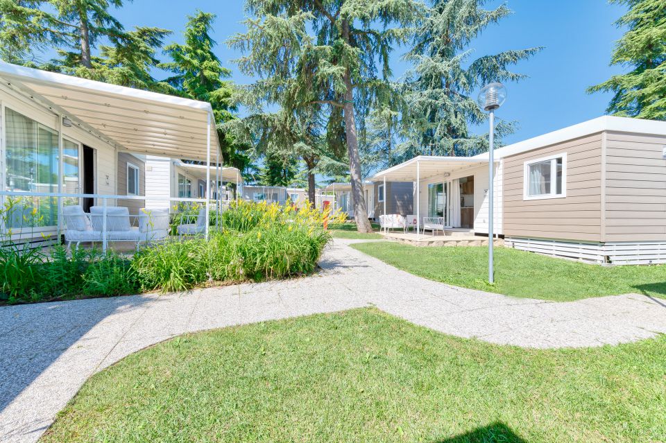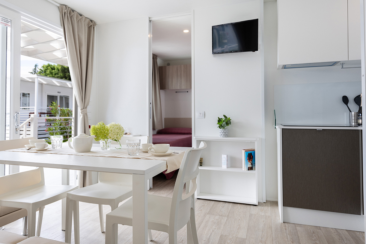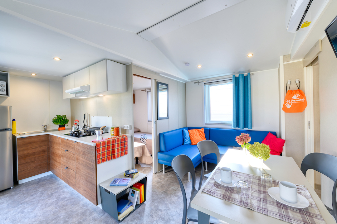 Eleganz, ein weiter Raum und Bequemlichkeit vereinen sich in Garden, die größte Mobilheim von San Benedetto Camping Relais.