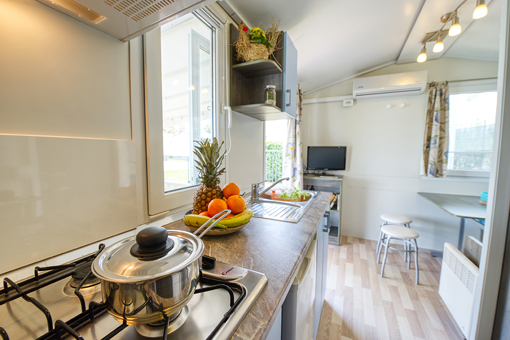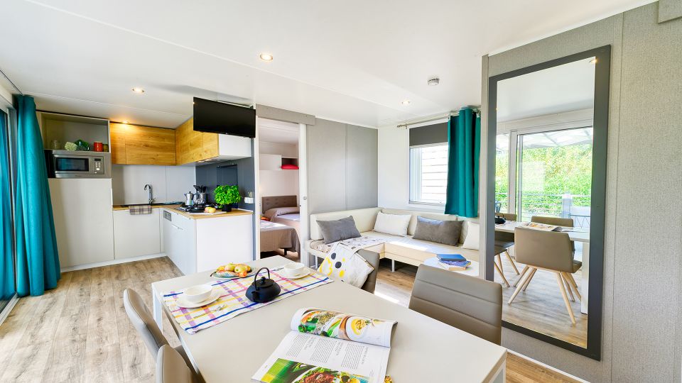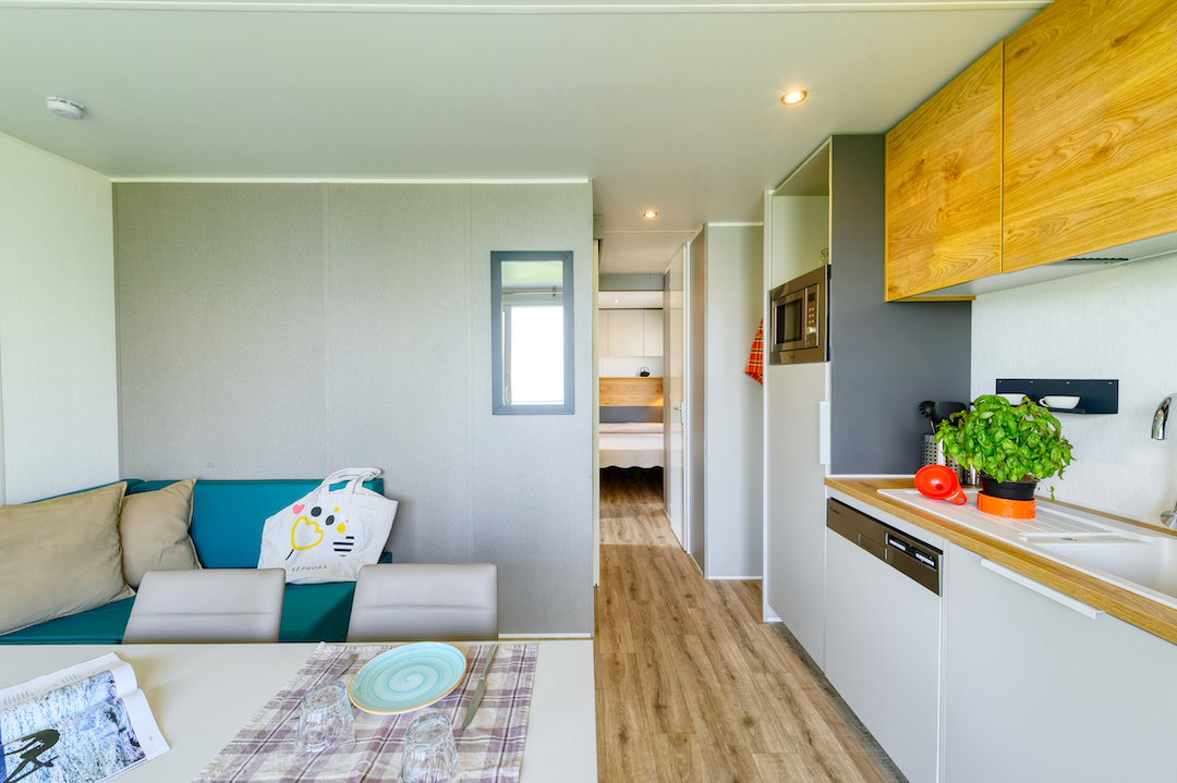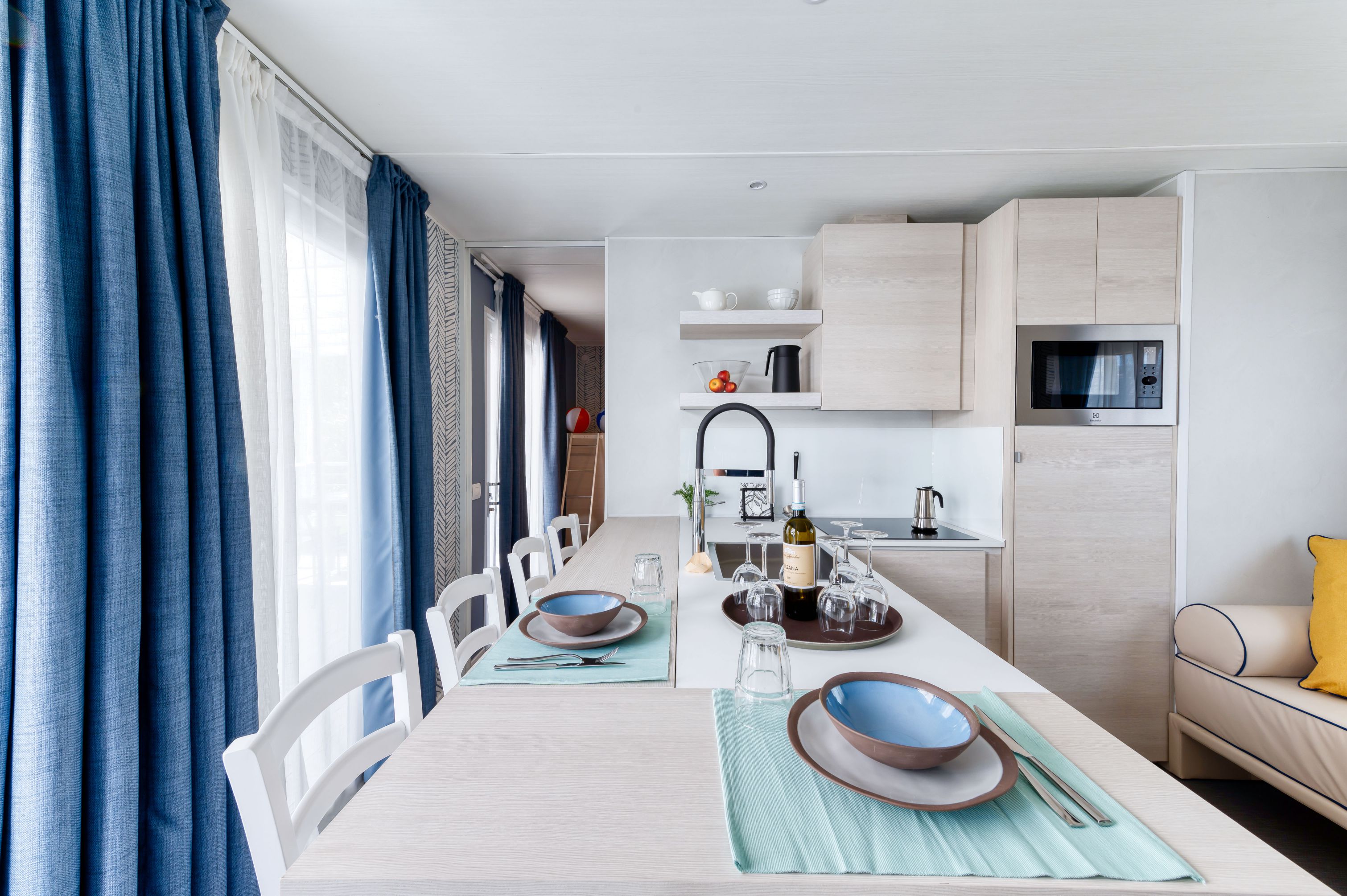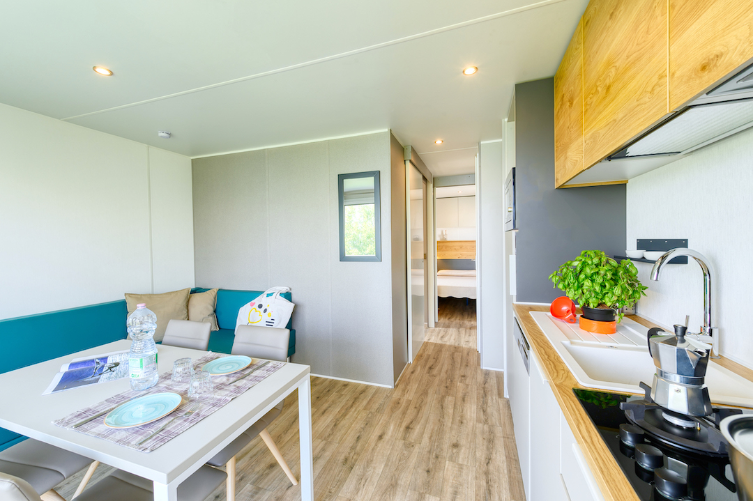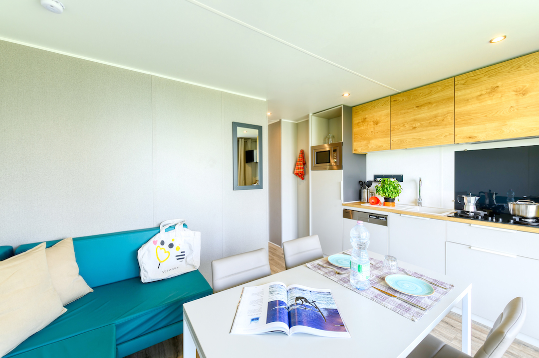 Der Küchenbereich, modern und funktional, ist mit allem ausgestattet, was Sie sich wünschen: vom Induktionsherd über die Mikrowelle, vom komfortablen Geschirrspüler bis zum großzügigen Kühlschrank, alles bereit für einen komfortablen und entspannten Urlaub. Das Satellitenfernsehen und die Klimaanlage / Heizung vervollständigen dieses Mobilheim, das aus innovativen und technologischen Materialien besteht, die mit Respekt für die Umwelt und den Komfort des Gastes ausgewählt wurden.