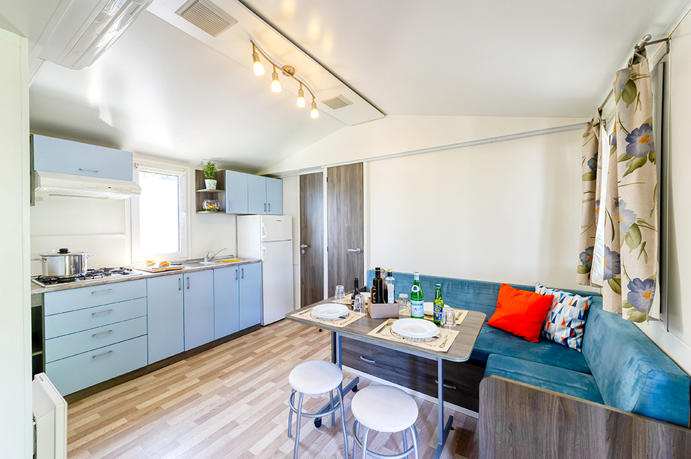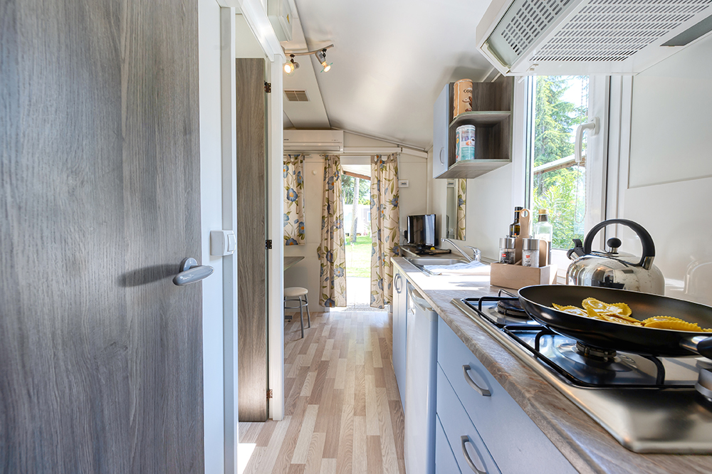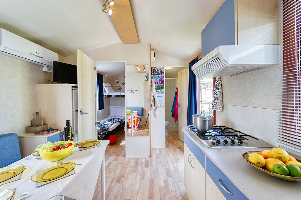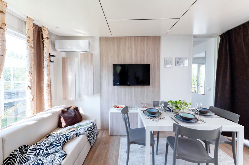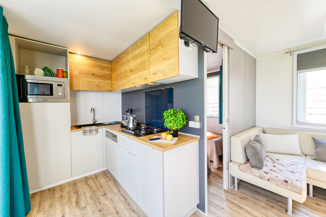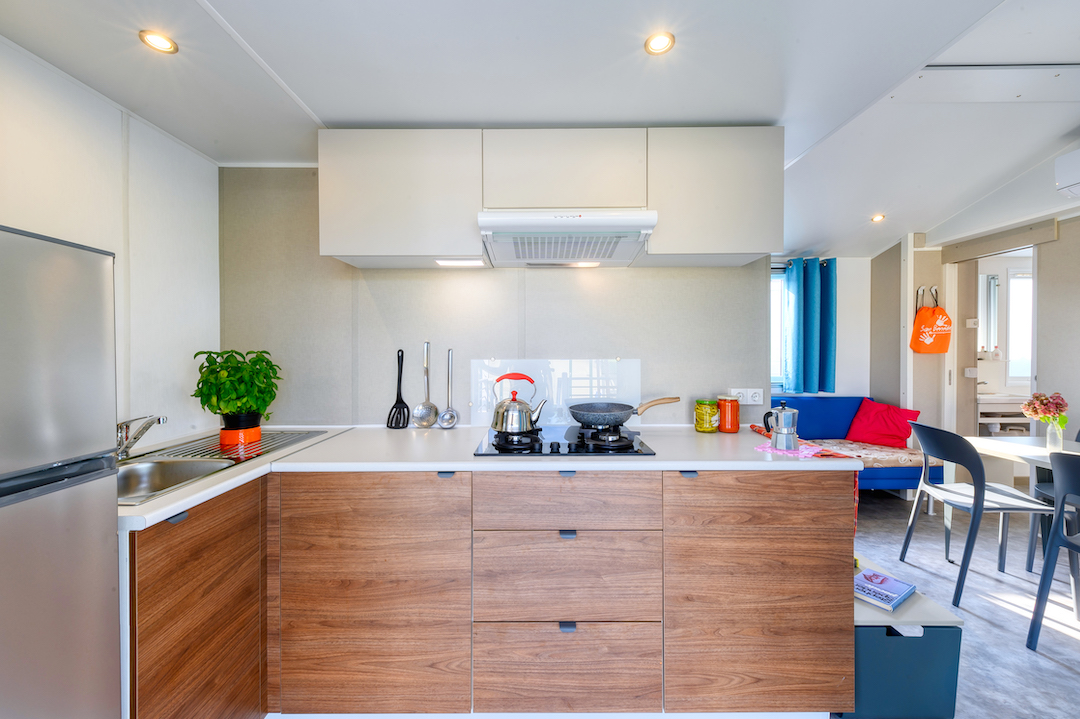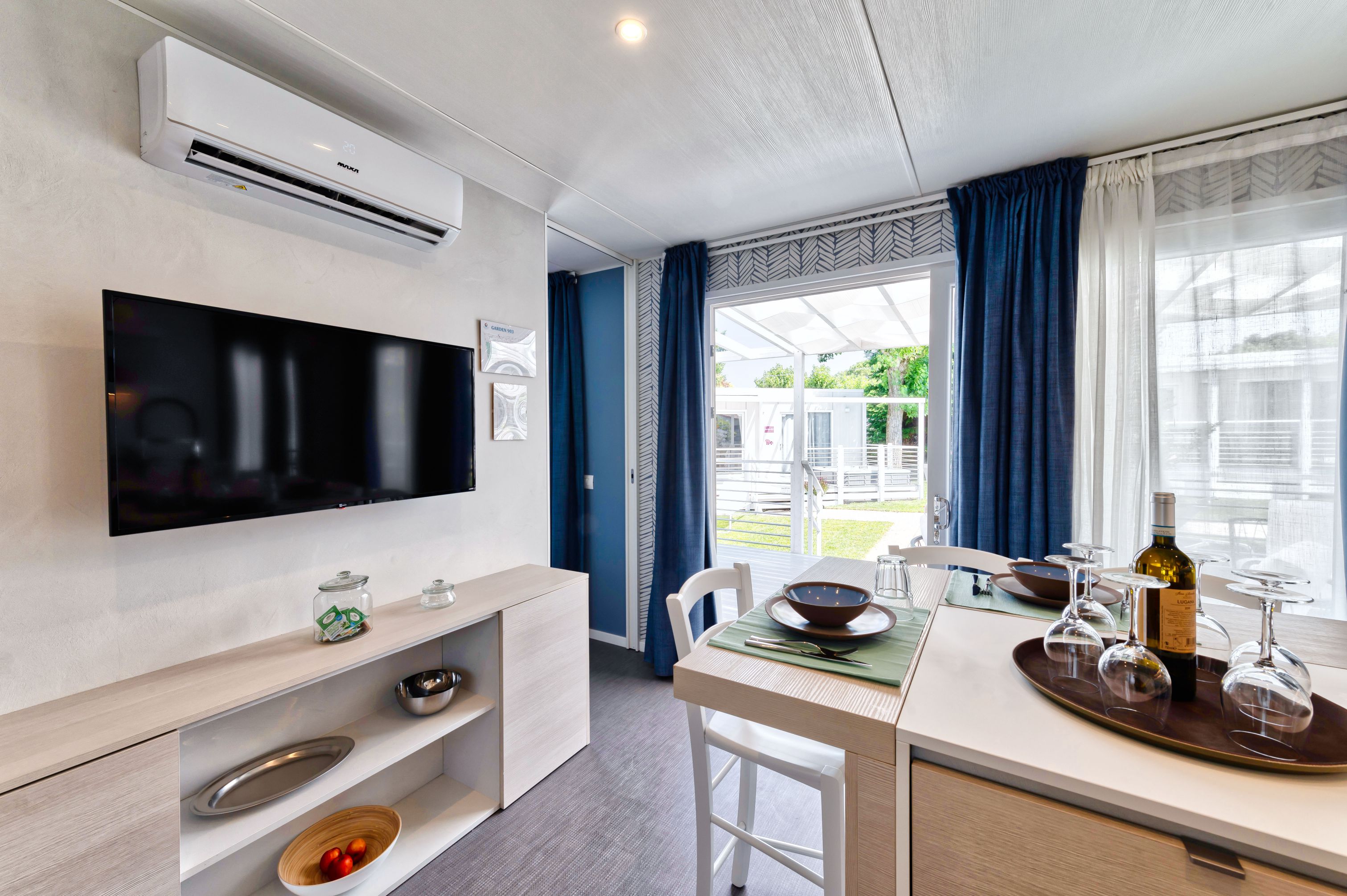 Der Küchenbereich, modern und funktional, ist mit allem ausgestattet, was Sie sich wünschen: vom Induktionsherd über die Mikrowelle, vom komfortablen Geschirrspüler bis zum großzügigen Kühlschrank, alles bereit für einen komfortablen und entspannten Urlaub. Das Satellitenfernsehen und die Klimaanlage / Heizung vervollständigen dieses Mobilheim, das aus innovativen und technologischen Materialien besteht, die mit Respekt für die Umwelt und den Komfort des Gastes ausgewählt wurden.