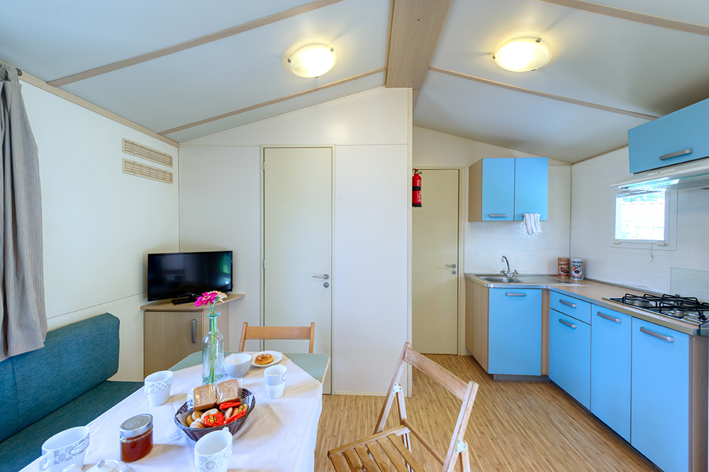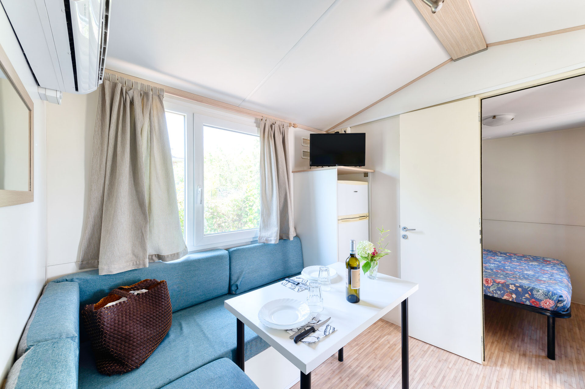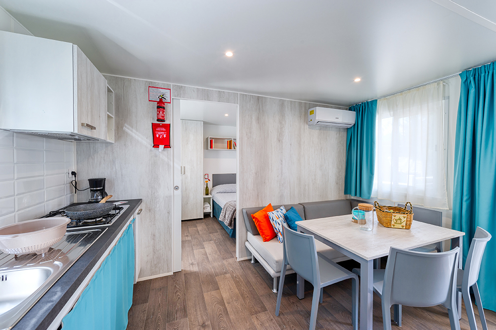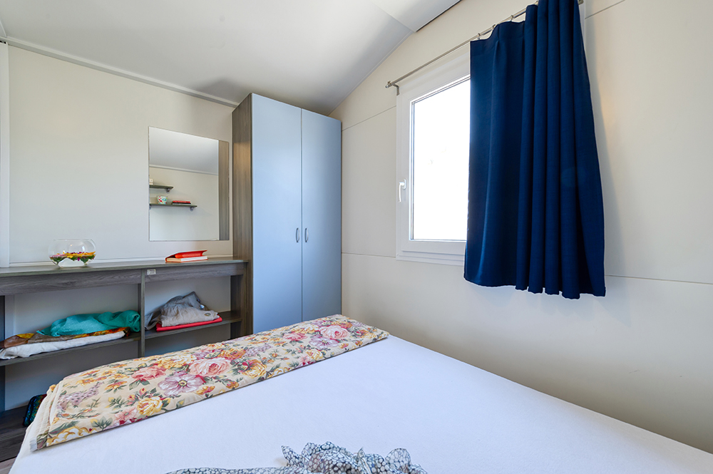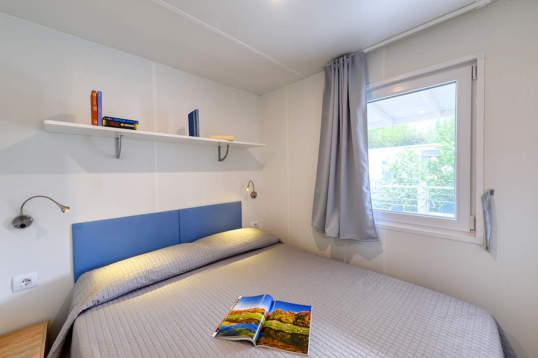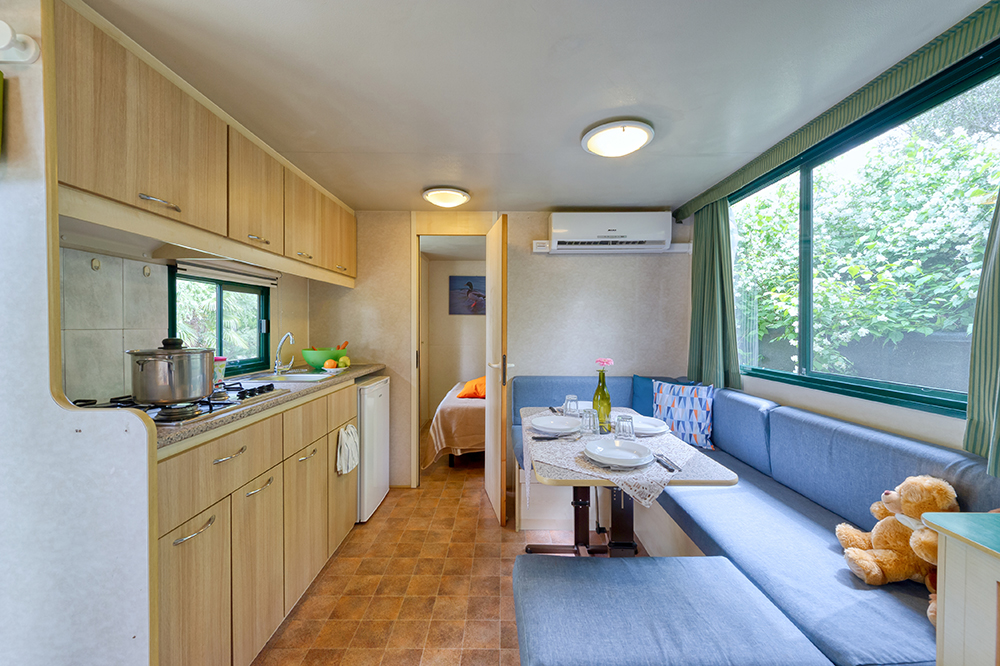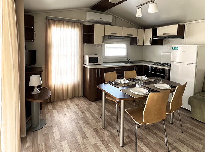 Dieses geräumige, 32 m² große Mobilheim befindet sich im zentralen Teil des Village, in der Nähe der wichtigsten Einrichtungen und bietet 5 Betten, ein Schlafzimmer mit Doppelbett und ein geräumiges Dreibettzimmer mit Einzelbetten, einen Wohnbereich mit Sat-TV und eine Küchenzeile mit Kühlschrank. Bad mit Dusche, Klimaanlage/Heizung.