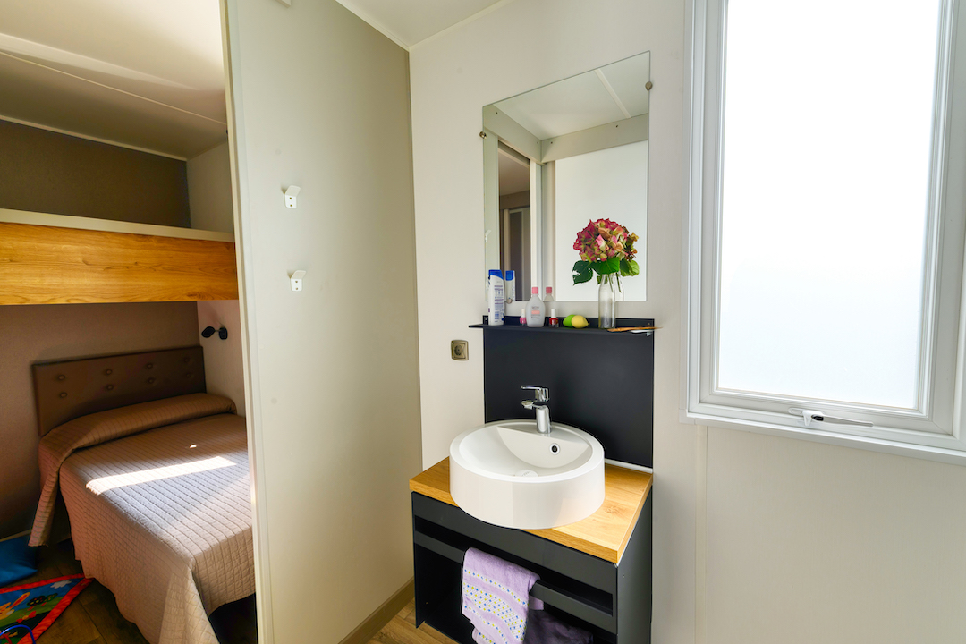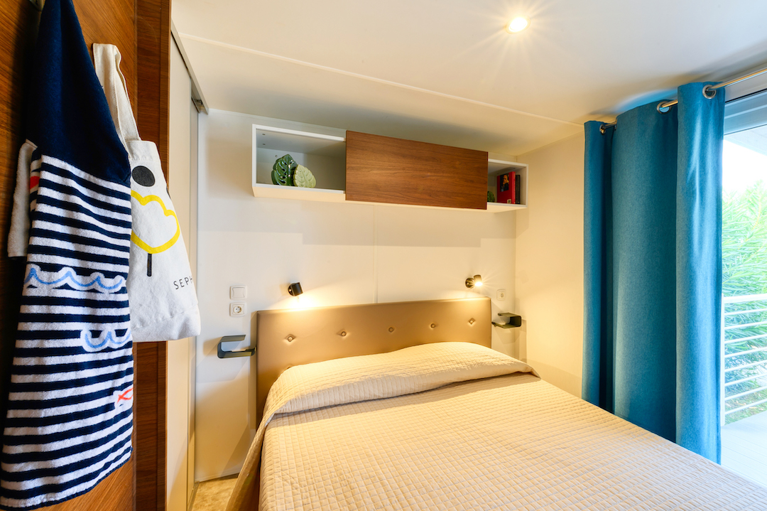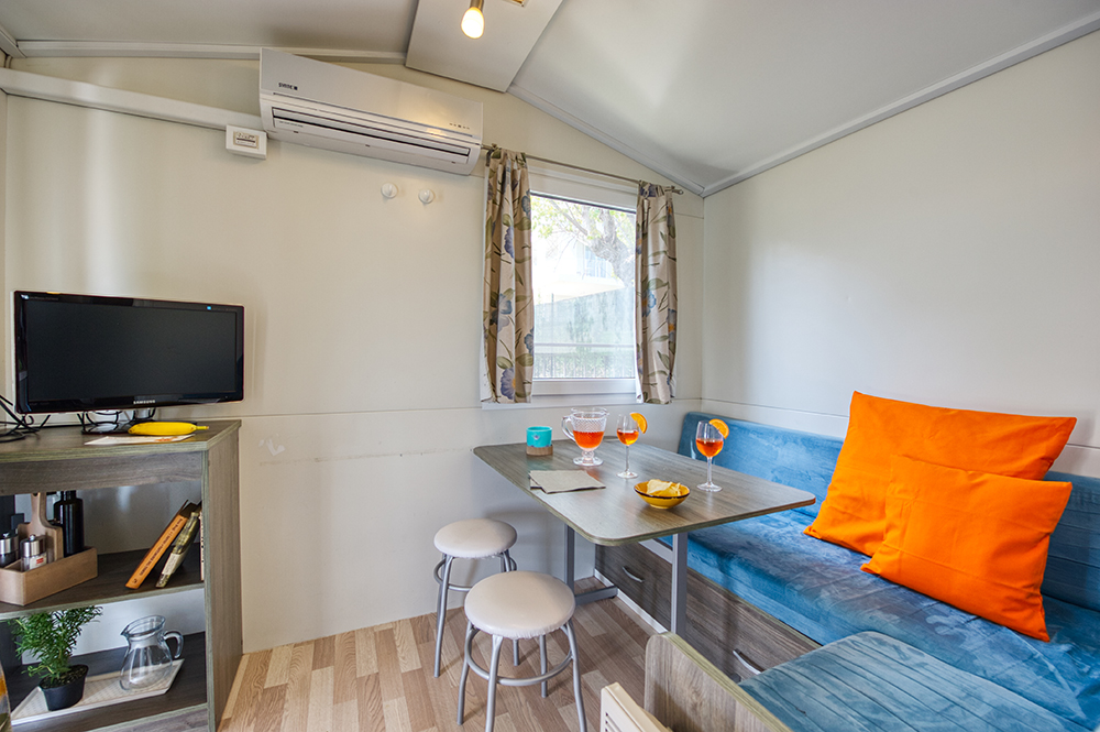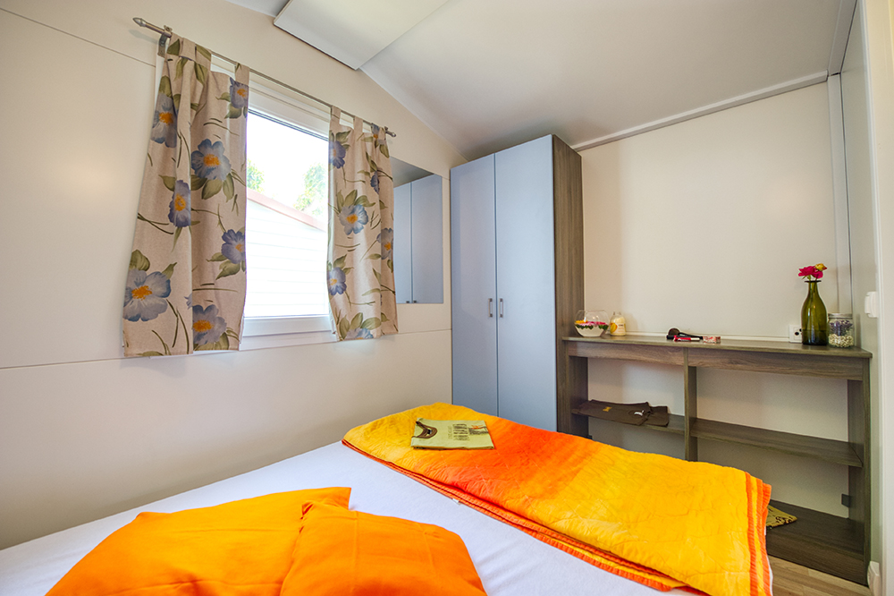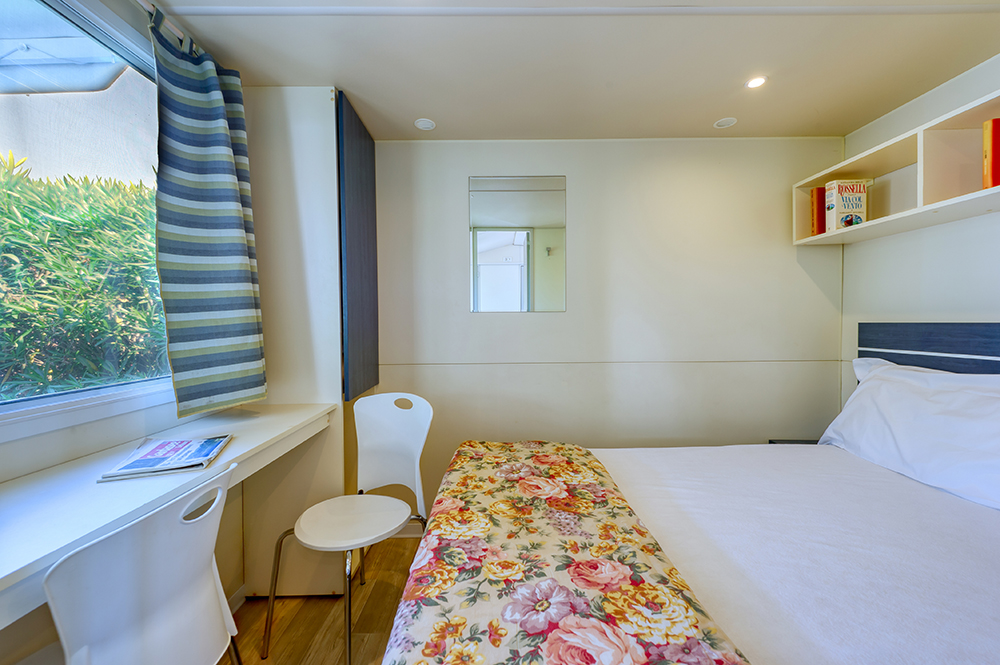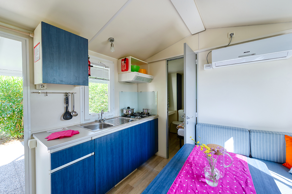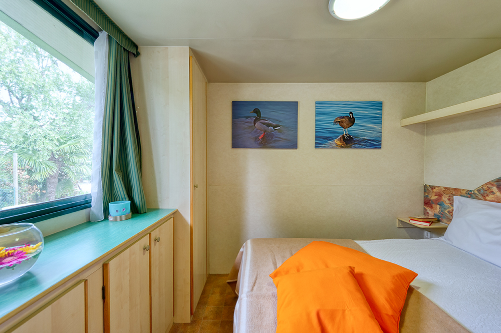 Dieses geräumige, 32 m² große Mobilheim befindet sich im zentralen Teil des Village, in der Nähe der wichtigsten Einrichtungen und bietet 5 Betten, ein Schlafzimmer mit Doppelbett und ein geräumiges Dreibettzimmer mit Einzelbetten, einen Wohnbereich mit Sat-TV und eine Küchenzeile mit Kühlschrank. Bad mit Dusche, Klimaanlage/Heizung.