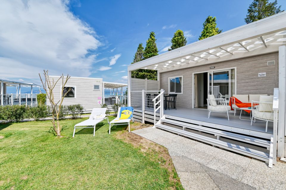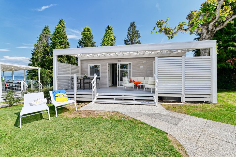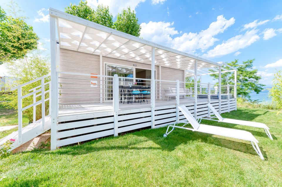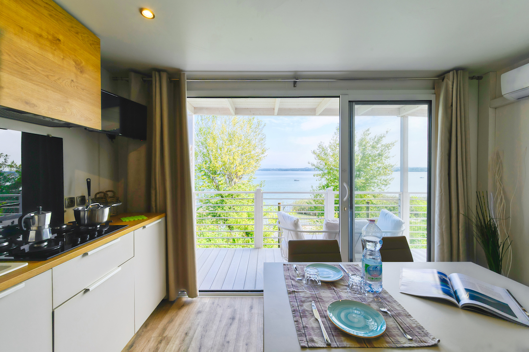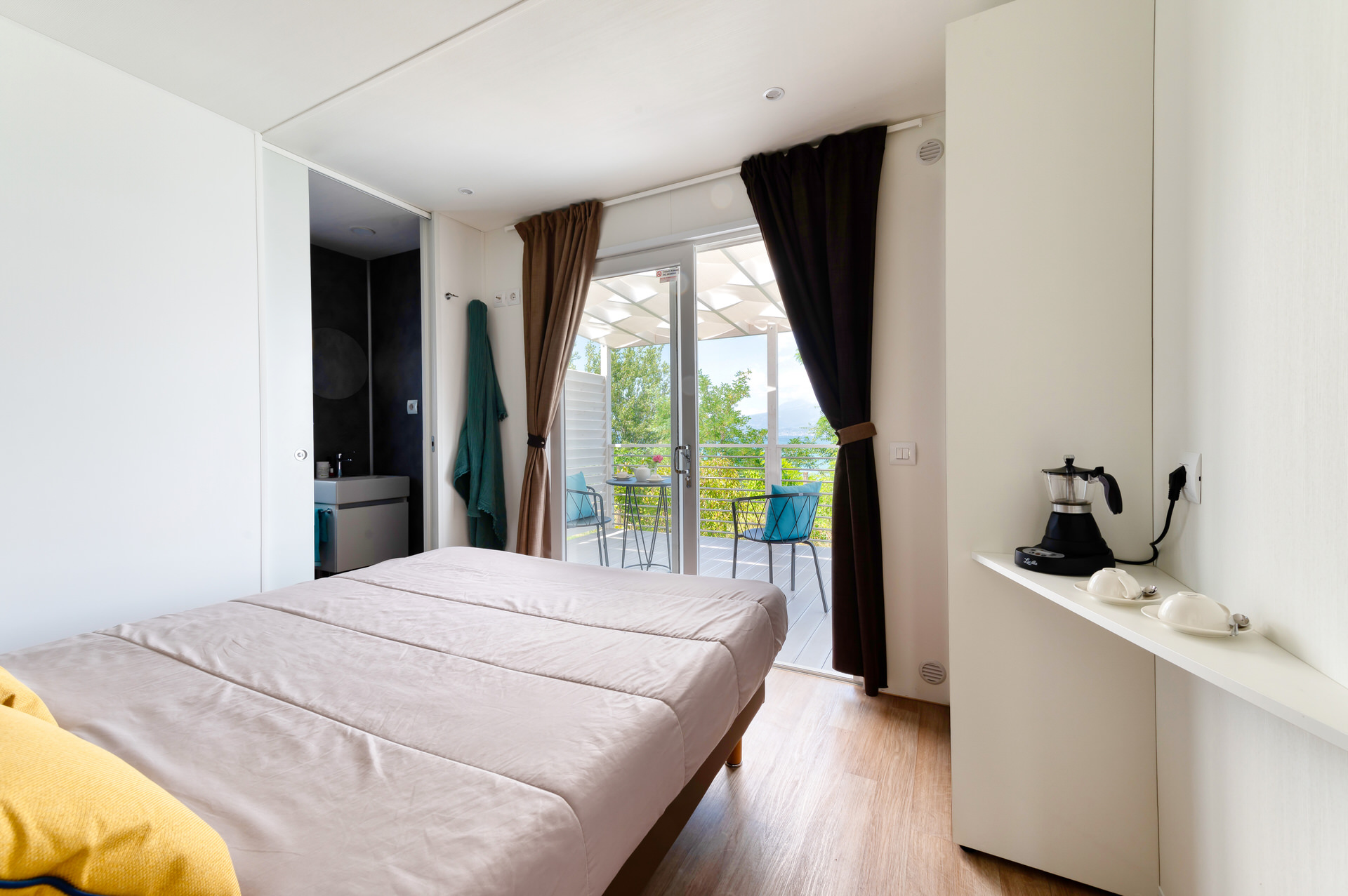 Suite ist ein revolutionäres 40 m2 großes Mobilheim, das sich in einer besonders panoramischen Gegend mit Blick auf den See befindet und sich perfekt in die Umgebung einfügt. Es stellt ein neues Mobilhome-Konzept dar, ausgestattet mit allem Komfort, elegant und zeitgemäß.