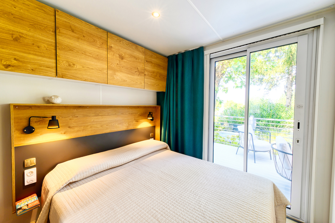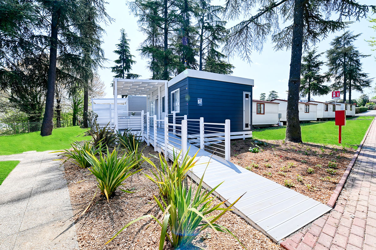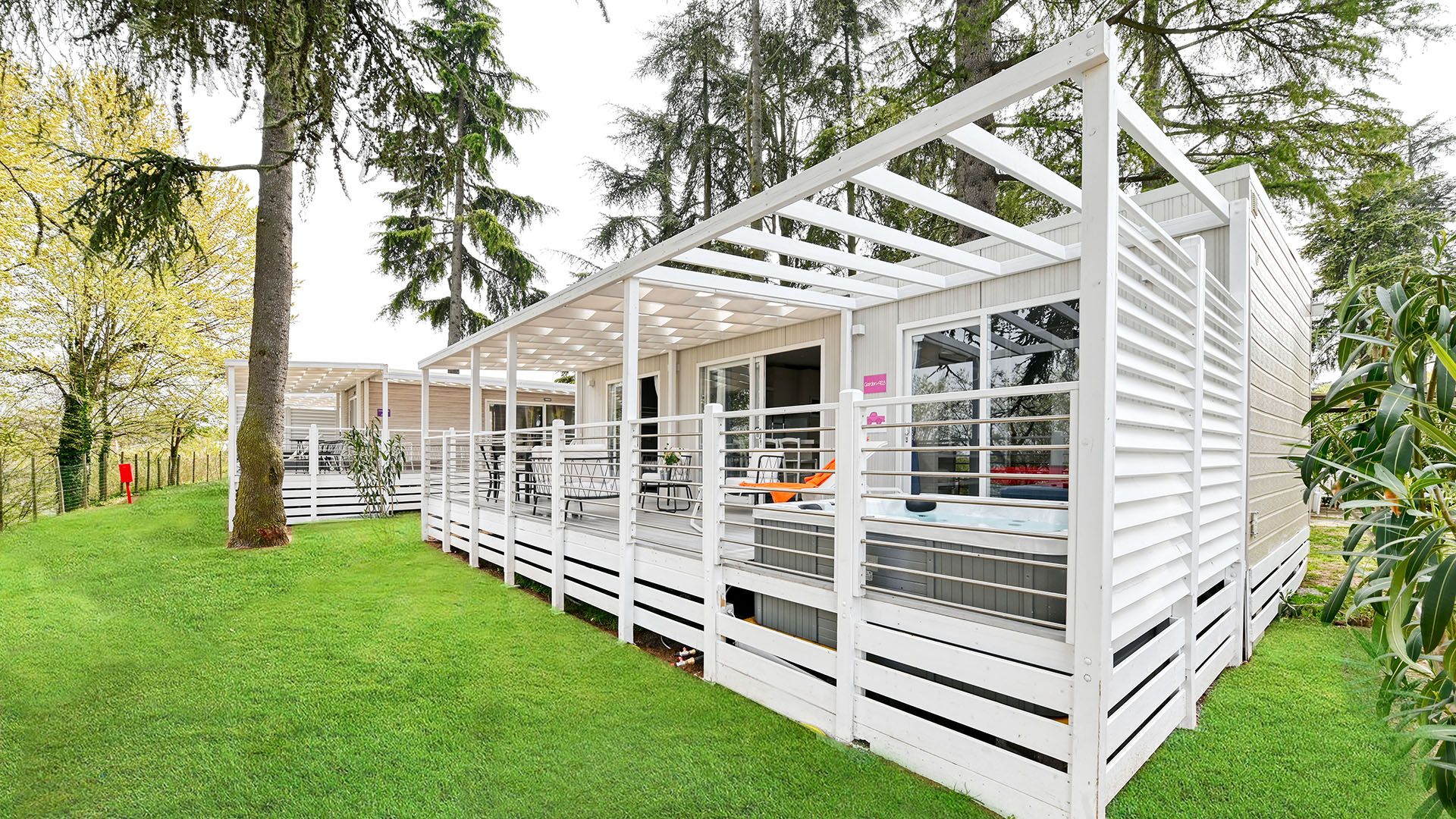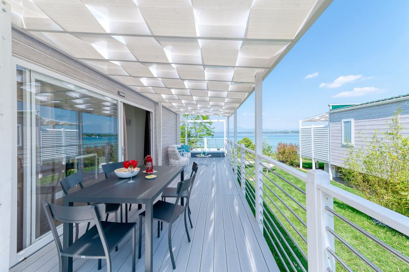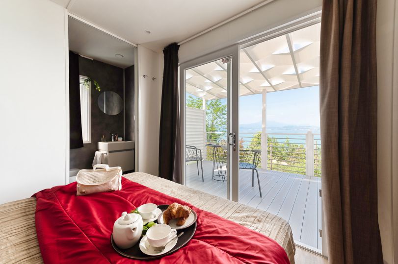 Suite ist ein revolutionäres 40 m2 großes Mobilheim, das sich in einer besonders panoramischen Gegend mit Blick auf den See befindet und sich perfekt in die Umgebung einfügt. Es stellt ein neues Mobilhome-Konzept dar, ausgestattet mit allem Komfort, elegant und zeitgemäß.
