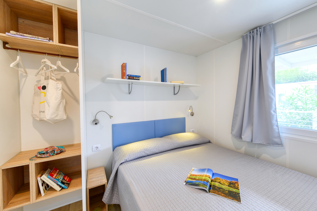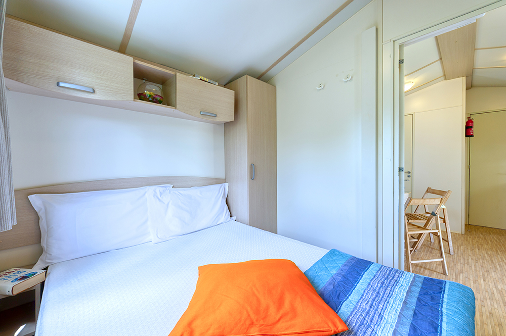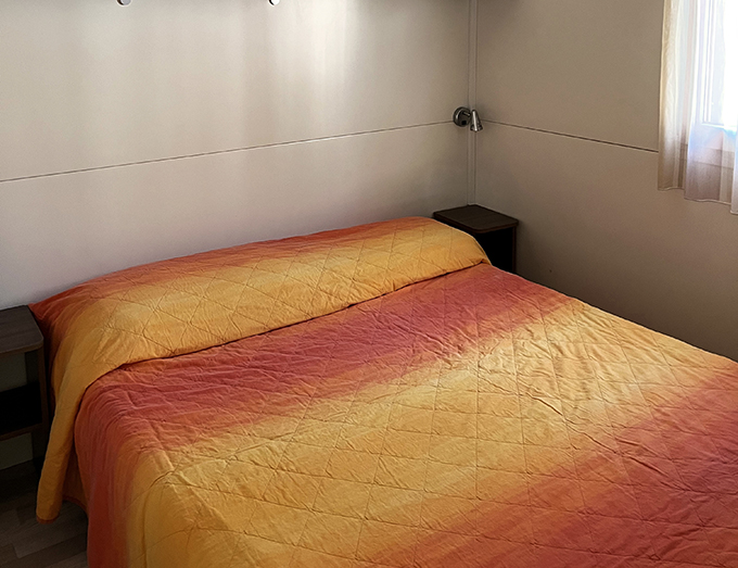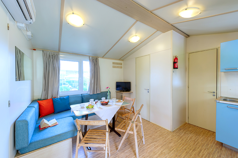 Dieses 30 m2 große Mobilheim für 4 Personen verfügt über ein Schlafzimmer mit Doppelbett und ein Schlafzimmer mit 2 Einzelbetten, 1 Badezimmer mit Dusche und einen geräumigeren Wohnbereich mit Sat-TV und Kochnische, Kühlschrank, Klimaanlage/Heizung.