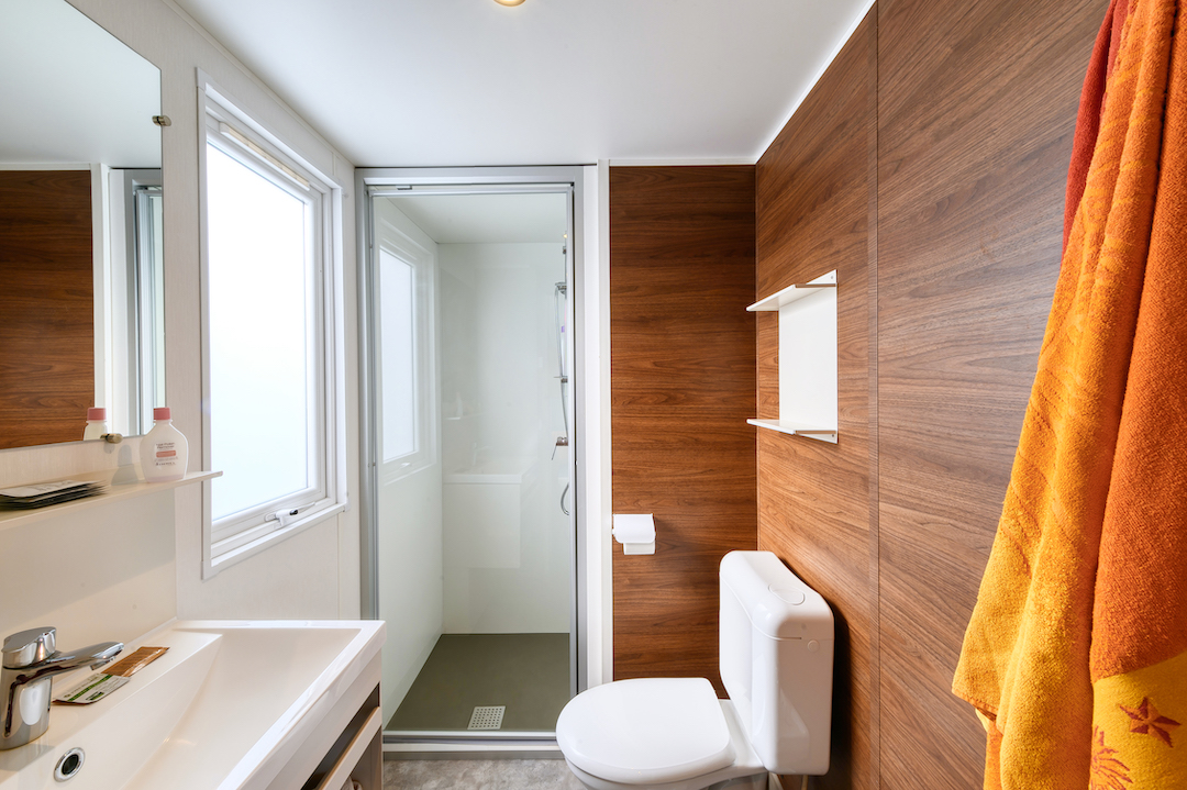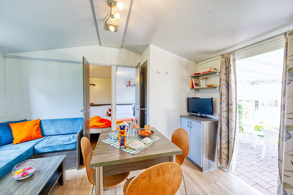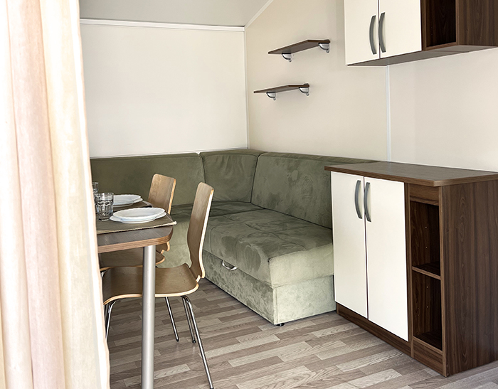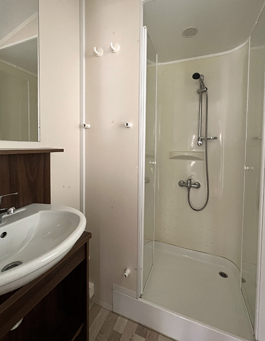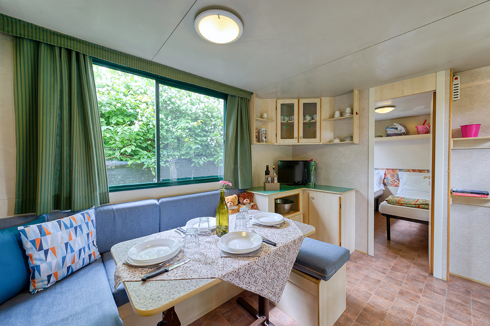 Dieses 30 m2 große Mobilheim für 4 Personen verfügt sich über ein Schlafzimmer mit Doppelbett und ein Schlafzimmer mit 2 Einzelbetten, einen geräumigen Wohnbereich mit Sat-TV und einer Küchenzeile, Kühlschrank, sowie Badezimmer mit Dusche.