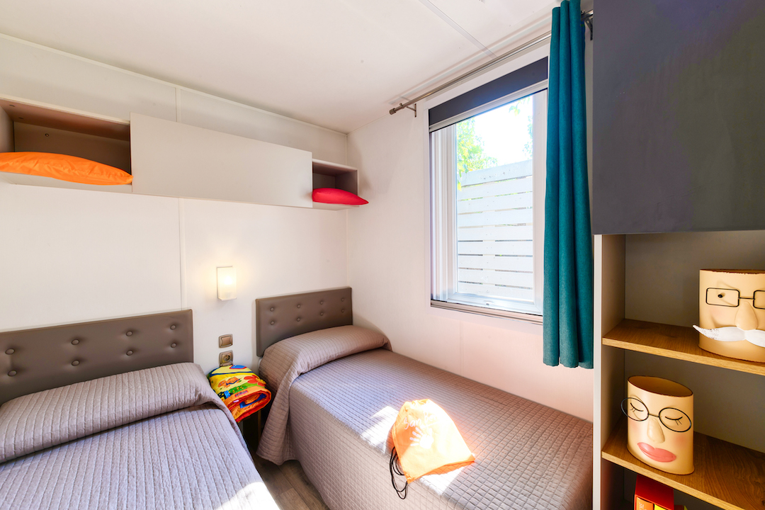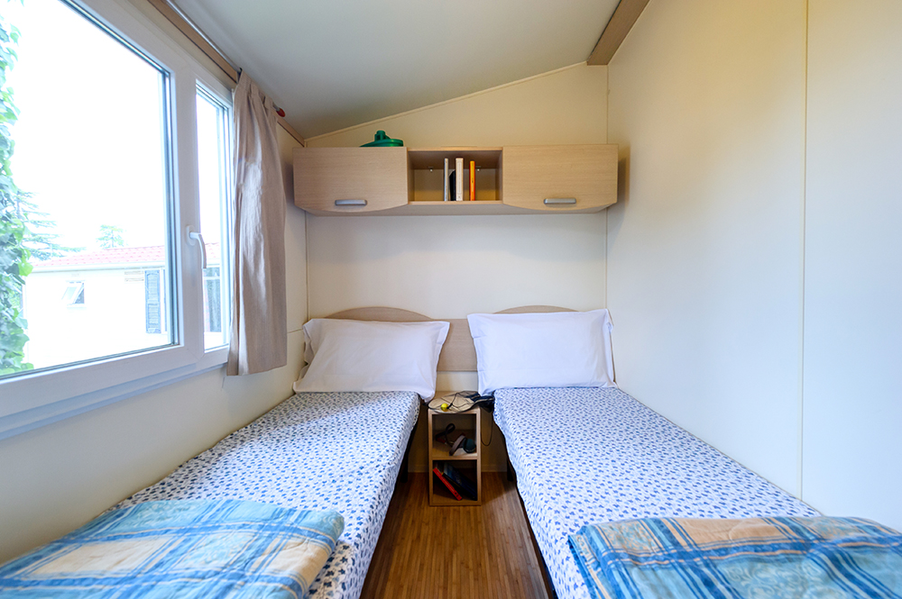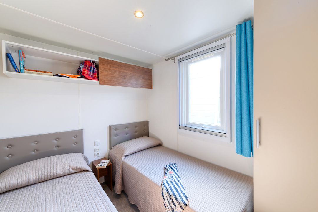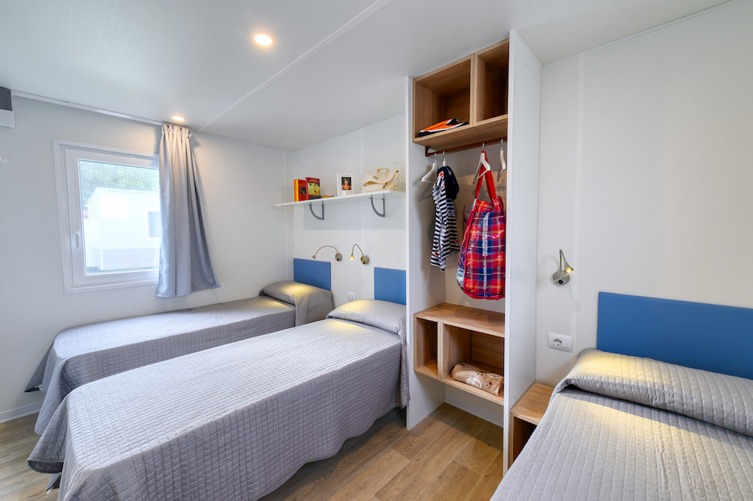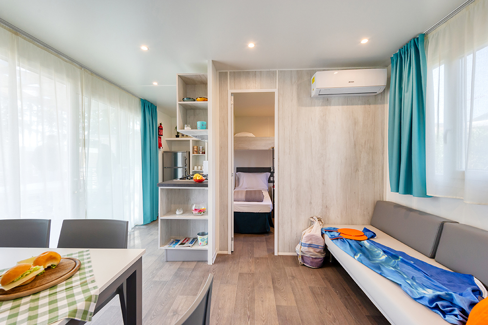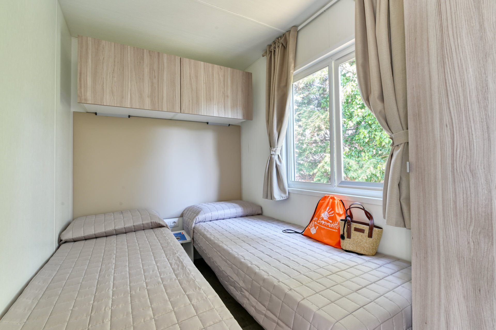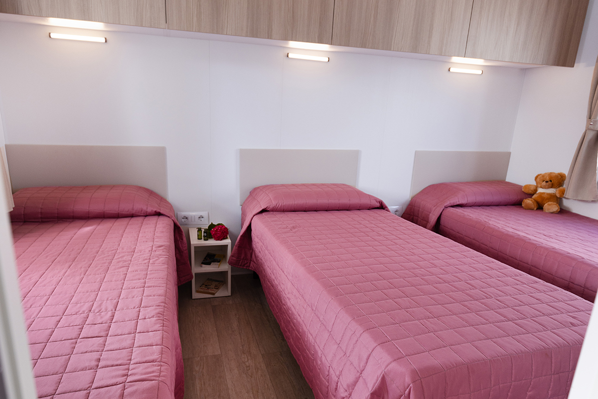 Komfortables und funktionales 24 m² großes Mobilheim mit einem Schlafzimmer mit Doppelbett und einem mit 3 Einzelbetten (Betten für 4 Erwachsene + 1 Kind unter 10 Jahren, max. 45 kg und 140 cm Körpergröße), Klimaanlage/Heizung, Küchenzeile, Kühlschrank, Wohnzimmer, Sat-TV, Bad mit Dusche.