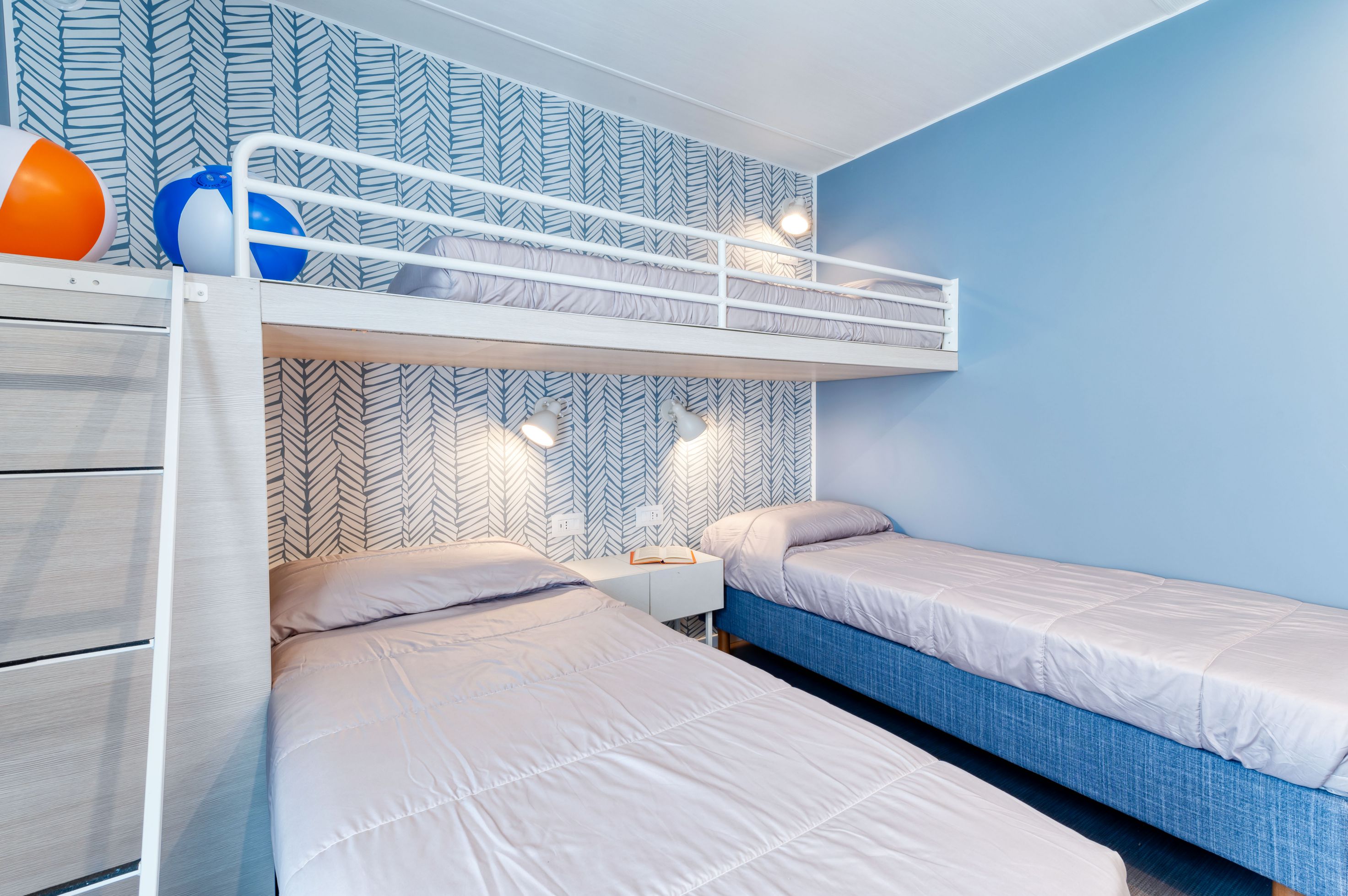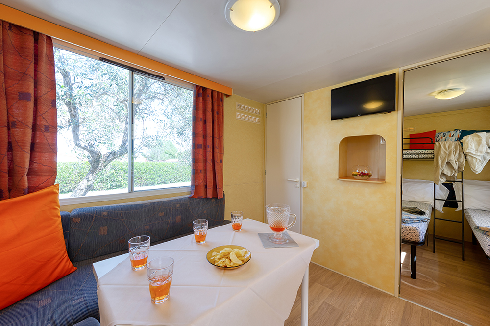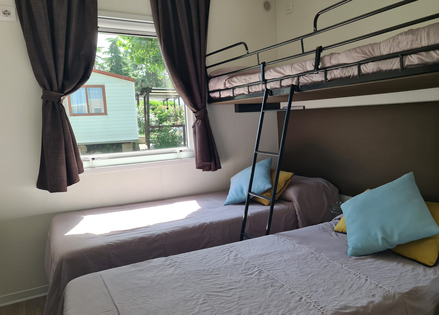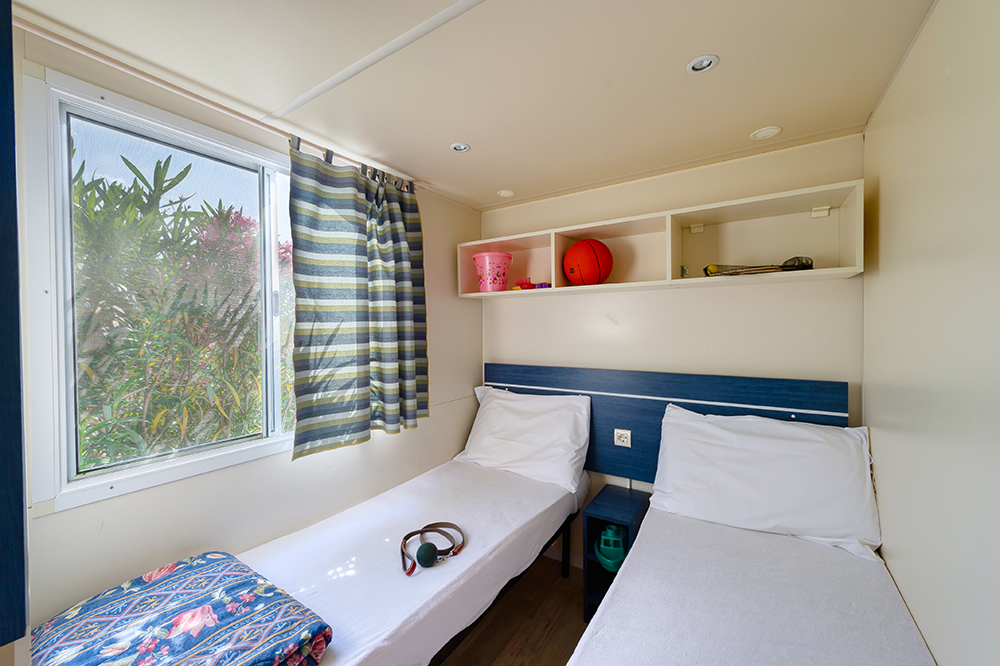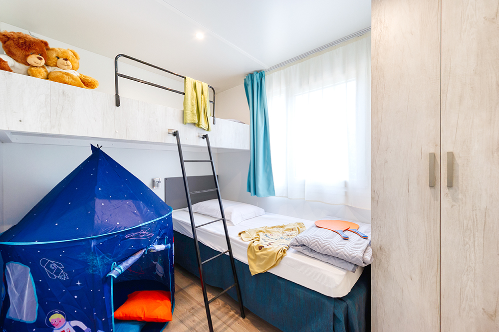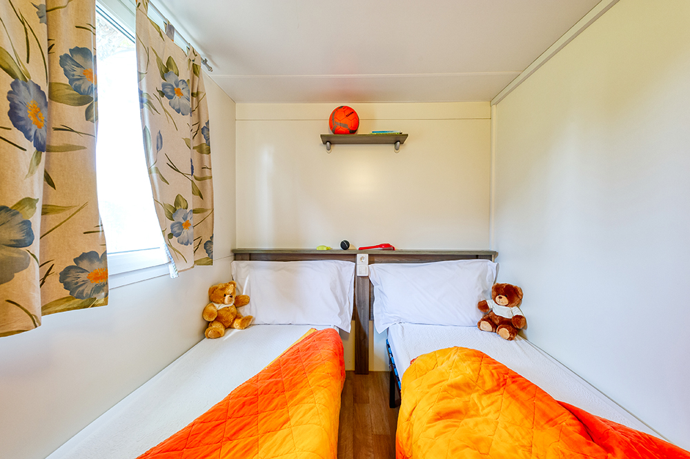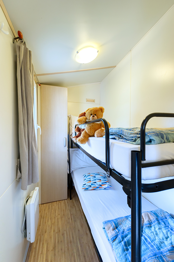 Komfortables und funktionales 24 m² großes Mobilheim mit einem Schlafzimmer mit Doppelbett und einem mit 3 Einzelbetten (Betten für 4 Erwachsene + 1 Kind unter 10 Jahren, max. 45 kg und 140 cm Körpergröße), Klimaanlage/Heizung, Küchenzeile, Kühlschrank, Wohnzimmer, Sat-TV, Bad mit Dusche.