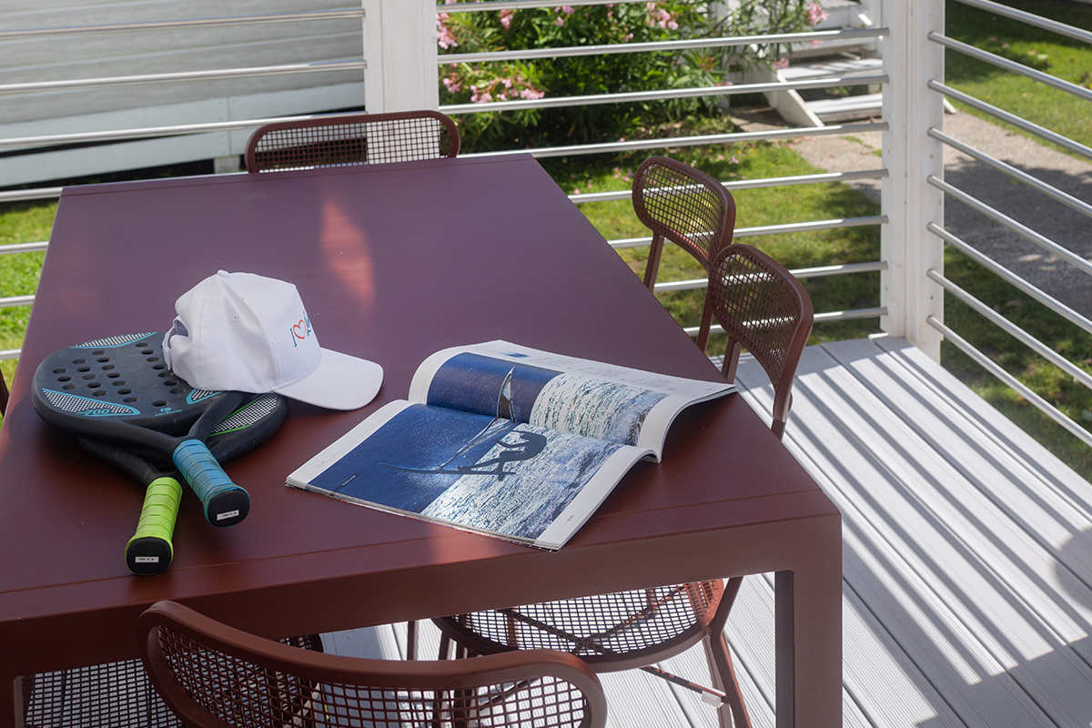 Draußen befindet sich eine große Holzterrasse mit Tisch und Stühlen, von dem Sie bequem die Hauptstraße des Village erreichen können.