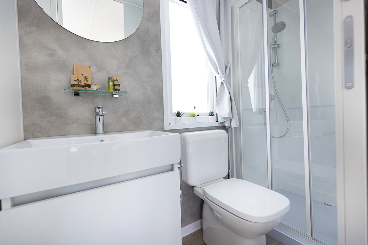 Praktisches 24 m² großes Mobilheim mit zwei Schlafzimmern, einem Doppel- und einem mit 2 Einzelbetten (Betten für 4 Erwachsene), Klimaanlage/Heizung, Küchenzeile, Kühlschrank, Wohnzimmer, Sat-TV, Bad mit Dusche.