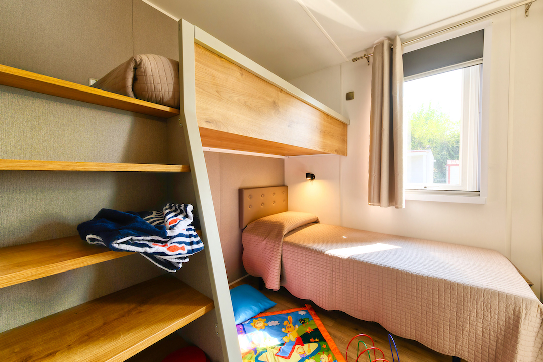 Geräumiges 34 m² großes Mobilheim, ideal für 6 Personen, mit einem Schlafzimmer mit Doppelbett und zwei Schlafzimmern mit 2 Einzelbetten, Etagenbett, großem Wohnbereich mit Sat-TV und funktionaler Küchenzeile mit Kühlschrank, Klimaanlage/Heizung und ein großes Badezimmer mit Dusche.