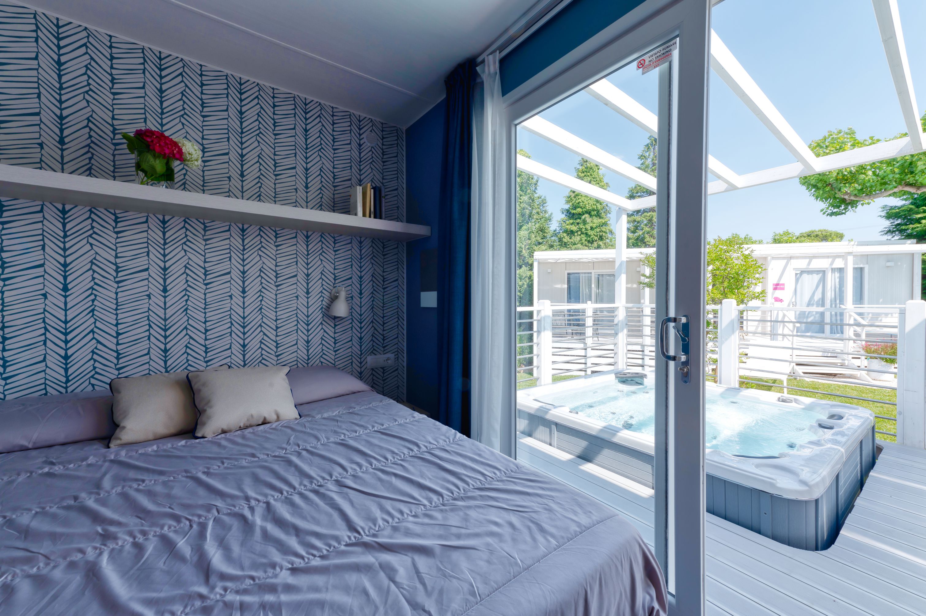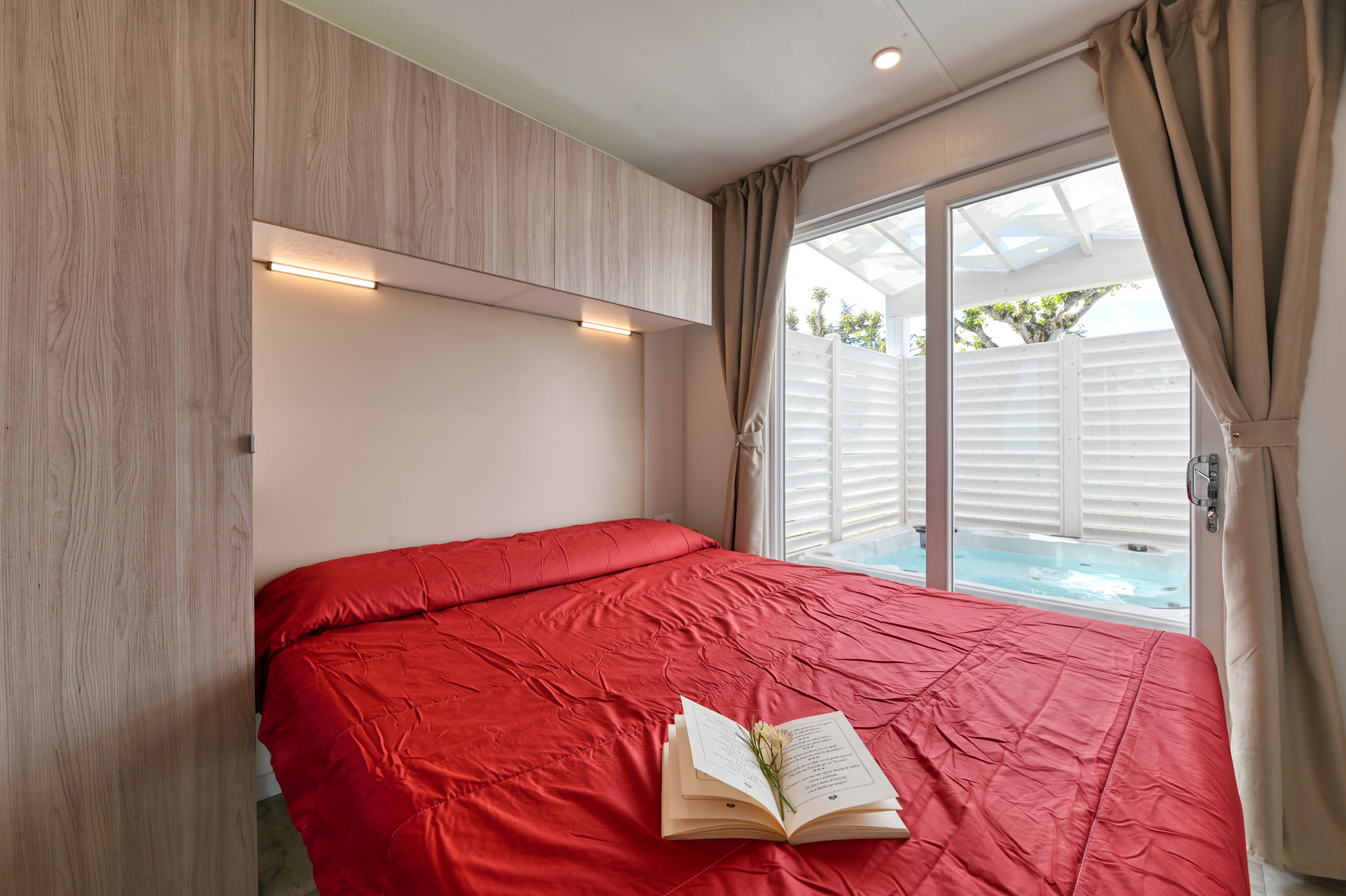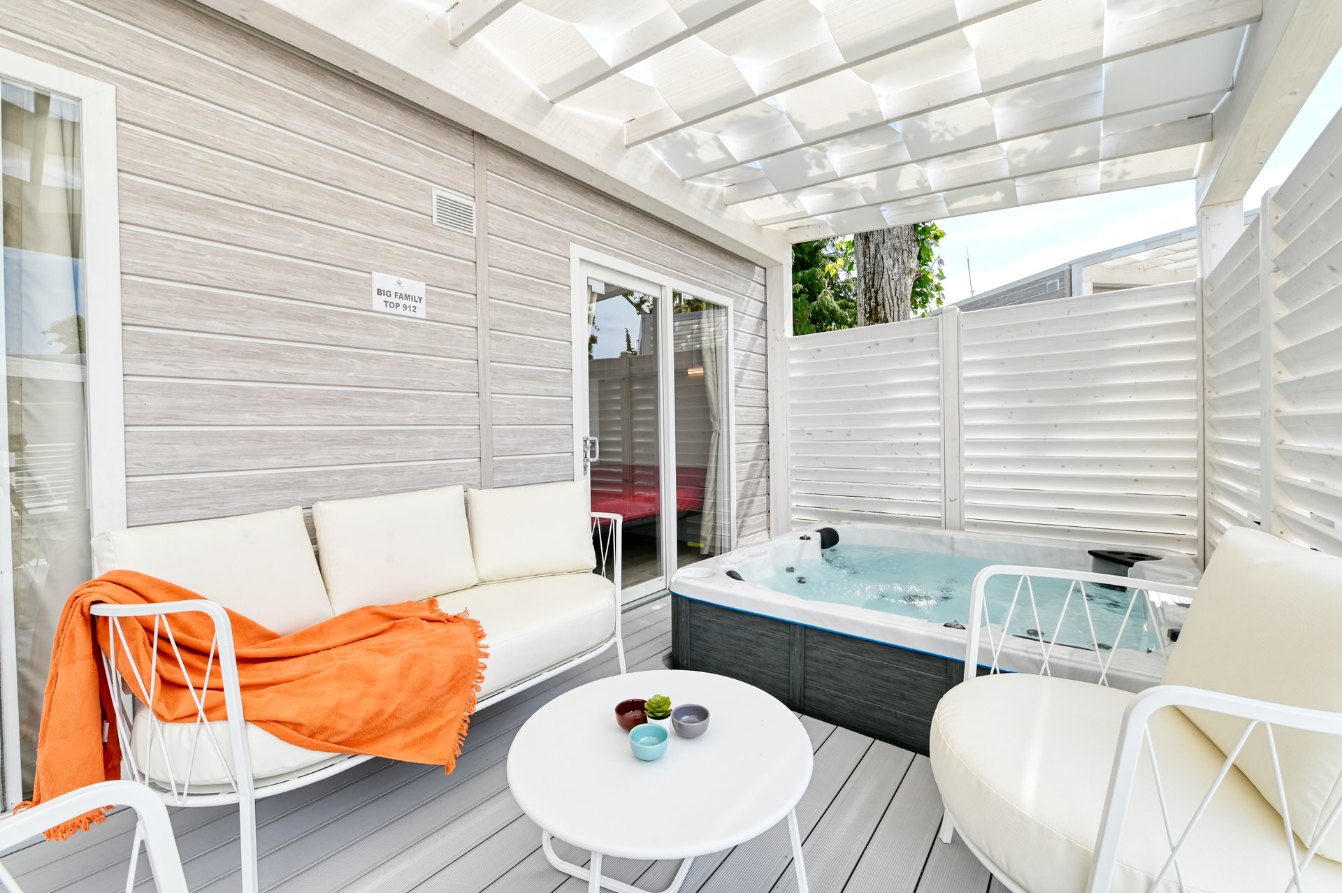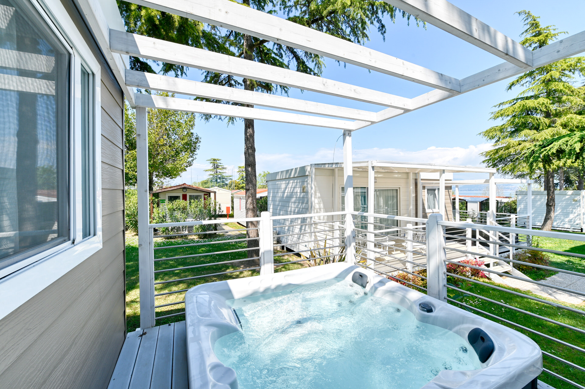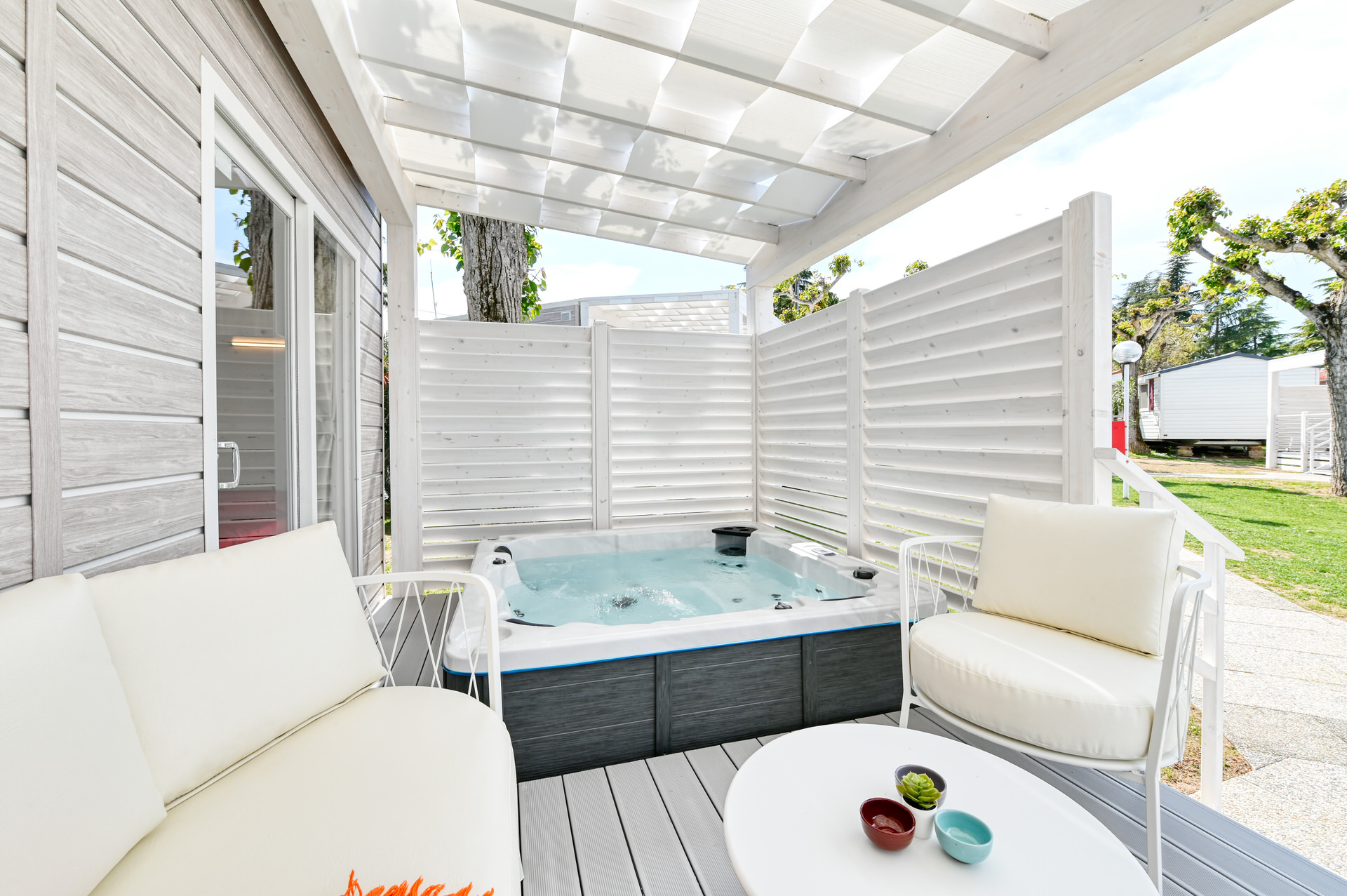 Um Ihren Aufenthalt noch exklusiver zu gestalten, finden Sie in der Mobilhome Villa auch einen Minipool mit Hydromassage im privaten Garten in der Nähe der großen Terrasse mit 2 bequemen Sonnenliegen.