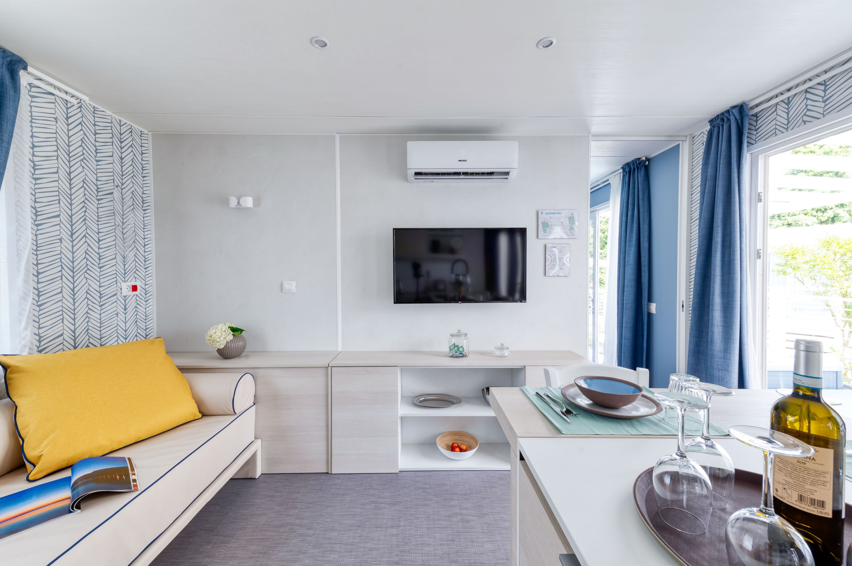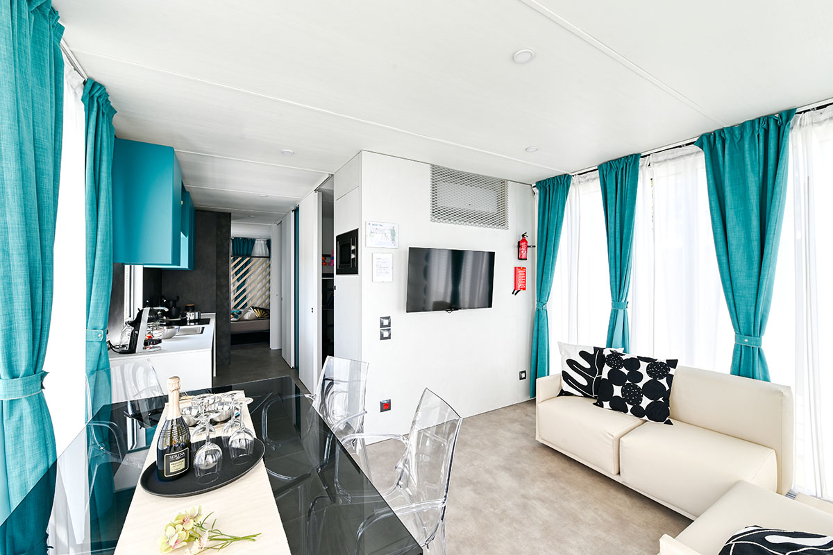 Mit einer Größe von 37 qm, Aqua bietet ein breites Wohnzimmer mit TV-Sat, Klima/Heizung und eine Kochnische open-space, ausstattet mit Spülmaschine, Kühlschrank und Microwellenherd und Induktionsherd, die beide auf einer weiteren, überdachten und ausgestatteten Terrasse hinaus gehen.