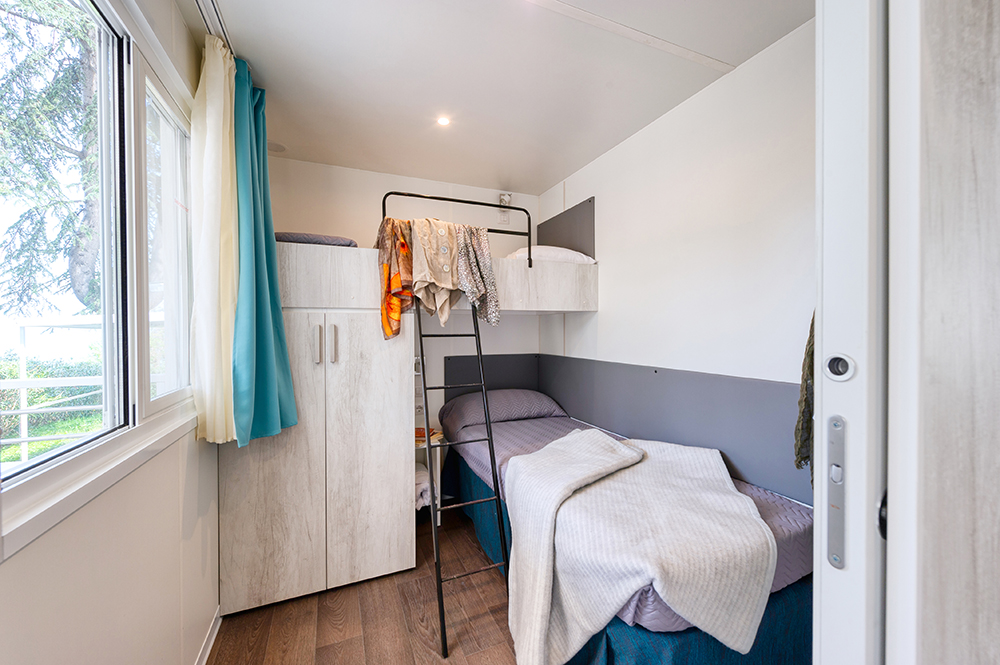 Mit einem exklusiven Blick auf den Gardasee bietet dieses Mobilheim von über 30m2 mit Klimaanlage/heizung für 4 Personen eine außergewöhnliche Aufteilung des Schlafbereichs mit Zugang zum Badezimmer mit Dusche, sowohl vom Hauptschlafzimmer als auch vom schönen Raum mit 2 Einzelbetten.