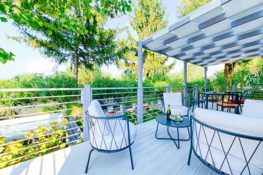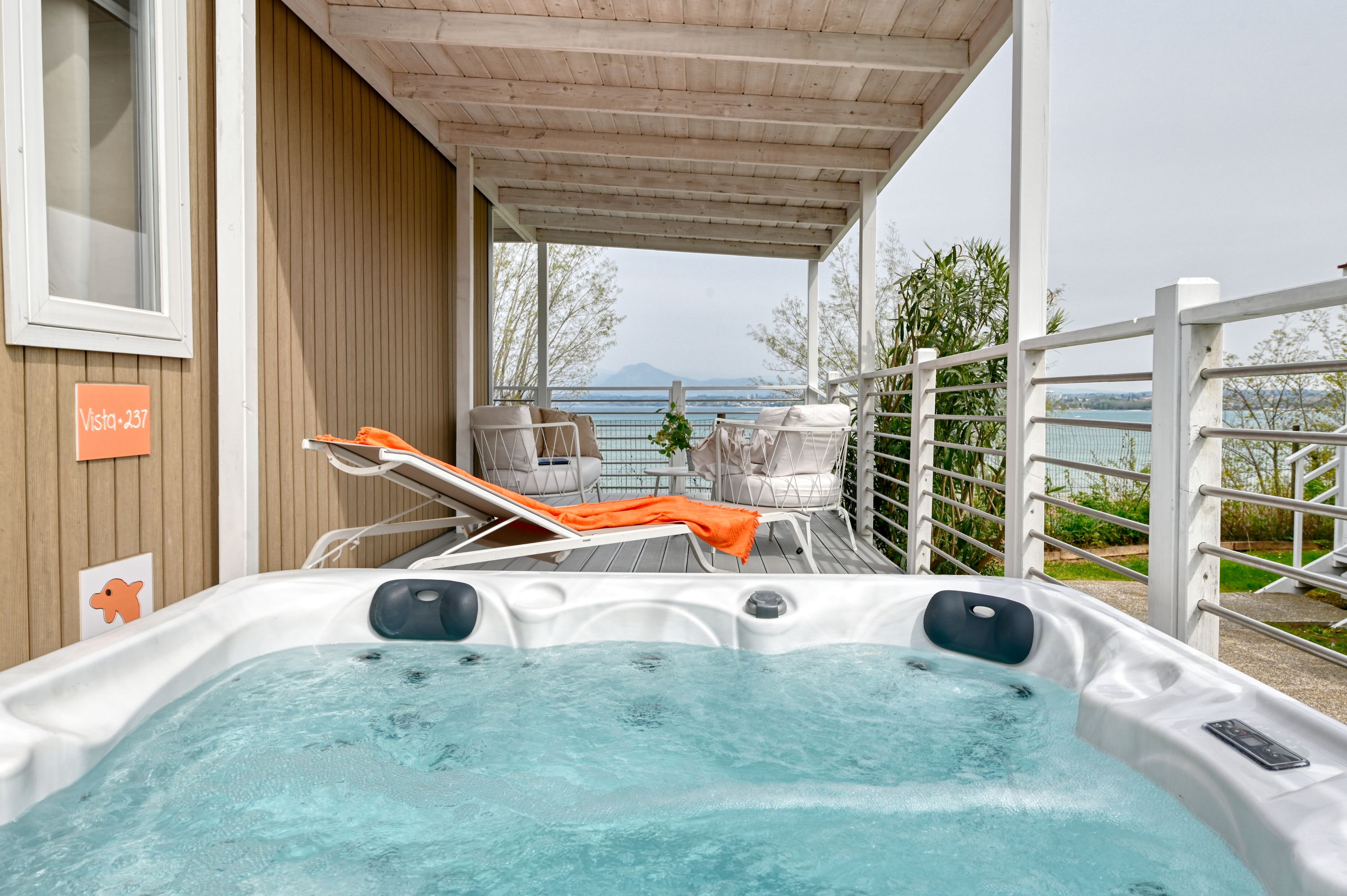 Draußen eine große überdachte Terrasse, ausgestattet mit Tisch und Stühlen und Sonnenliege. Um Ihren Aufenthalt noch weiter zu verbessern, steht Ihnen ein exklusiver Hydromassage-Minipool (Erstausstattung Handtücher und Bademäntel inklusive, und Erstausstattung an Bettwäsche inklusive) zur Verfügung, der Ihnen Momente absoluter Entspannung mit Blick auf den See garantiert.
