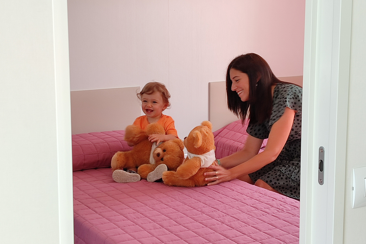 Es bietet ein großes Schlafzimmer mit Doppelbett, in dem auch ein Kinderbett oder ein kleines Bett untergebracht werden kann, und ein geräumiges Schlafzimmer mit 2 Einzelbetten und einer großen Spielecke. Das Badezimmer ist mit einer Hydromassage-Dusche und Handtuchset sowie Bademänteln ausgestattet, Klimaanlage/Heizung. Moderne und geräumige Wohnzimmer mit Open Face und einer Küchenzeile mit Mikrowelle und Kühlschrank.